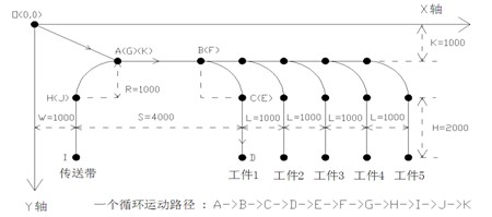 通常大多数用户会将X、Y的运动轨迹确定为矩形,即Y轴上下运动完成后X轴再水平运动,然后Y轴再次上下运动,如此反复进行。但这样的方式会导致比较强烈的抖动,并且造成一定的时间浪费。因此,可采用图2所示的运动轨迹,在2个拐弯处,X、Y轴进行一段半径为R的圆弧插补运动,这样可大大减弱抖动,且能节省时间。A点为起始点,抓取并放置第1个工件的路径为A→B→C→D→E→F→G→H→I→J→K,抓取并放置第2个工件的路径与第一个相同,只不过A→B和F→G的距离增加了长度L,第3个、第4个、第5个亦然。