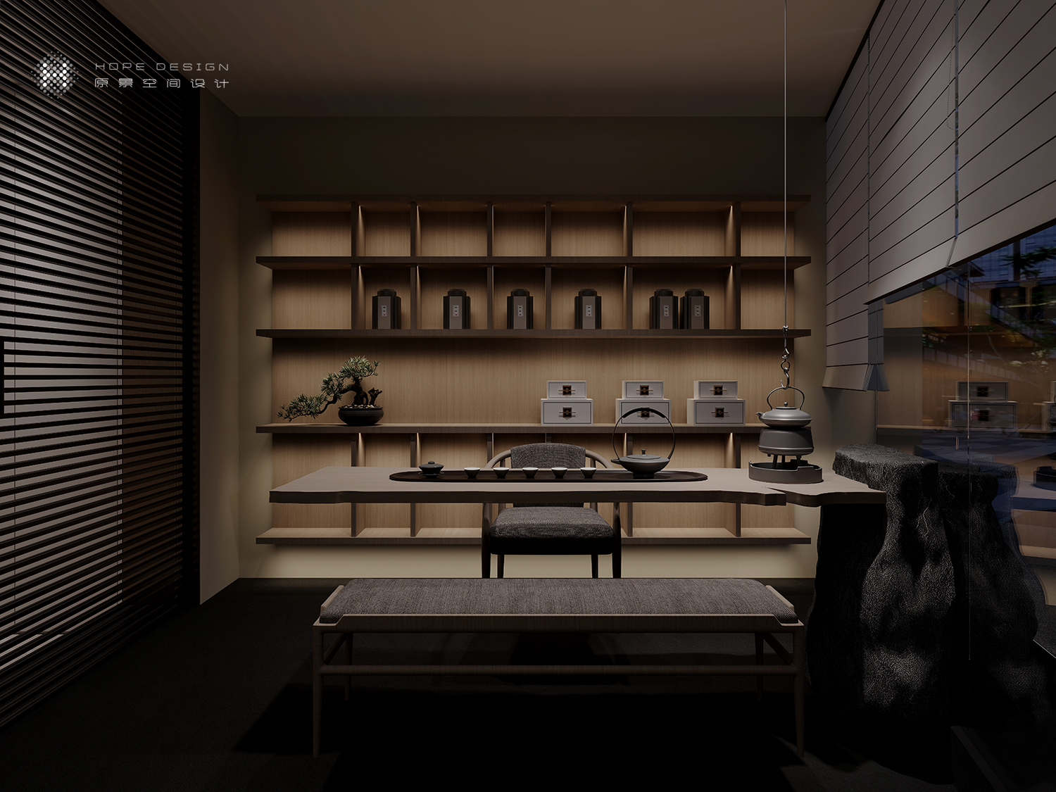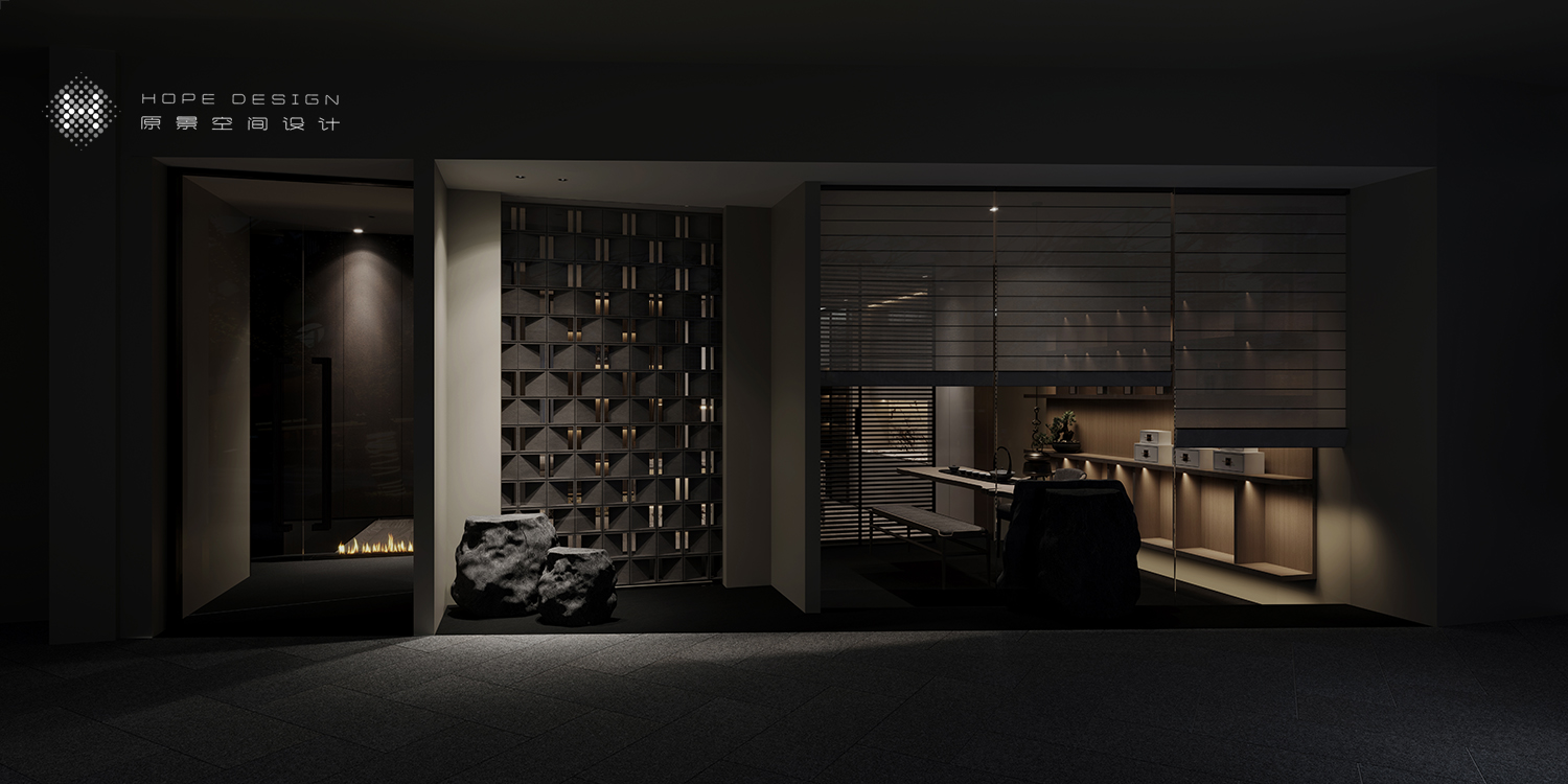 曲径通幽之时,木饰格栅为空间渲染着神秘之感,茶室弥漫而出的气息成为路引。进入茶室,精炼的线条感亦为空间增添着几分灵动。
