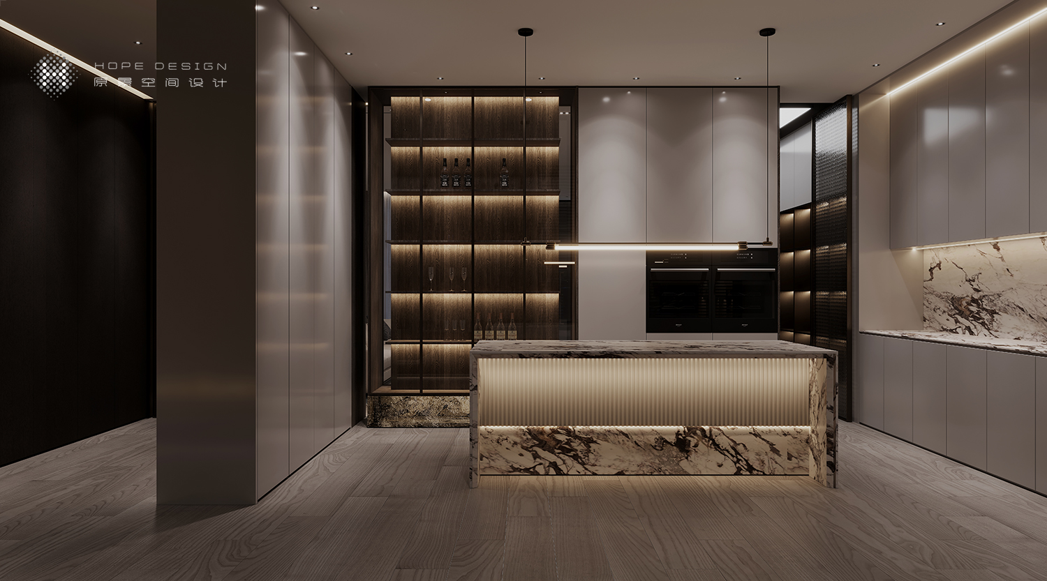 餐厅区域以新时代的标志映入眼帘,透光石与岩板相辅相成,光面烤漆板与玻璃材质的通透彰显饱满生机。