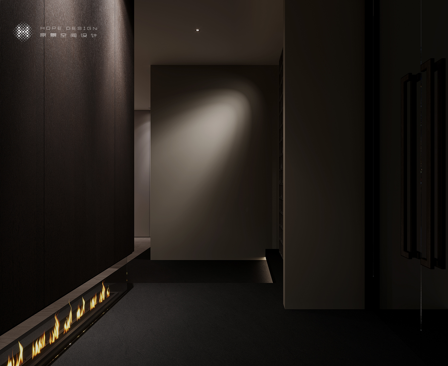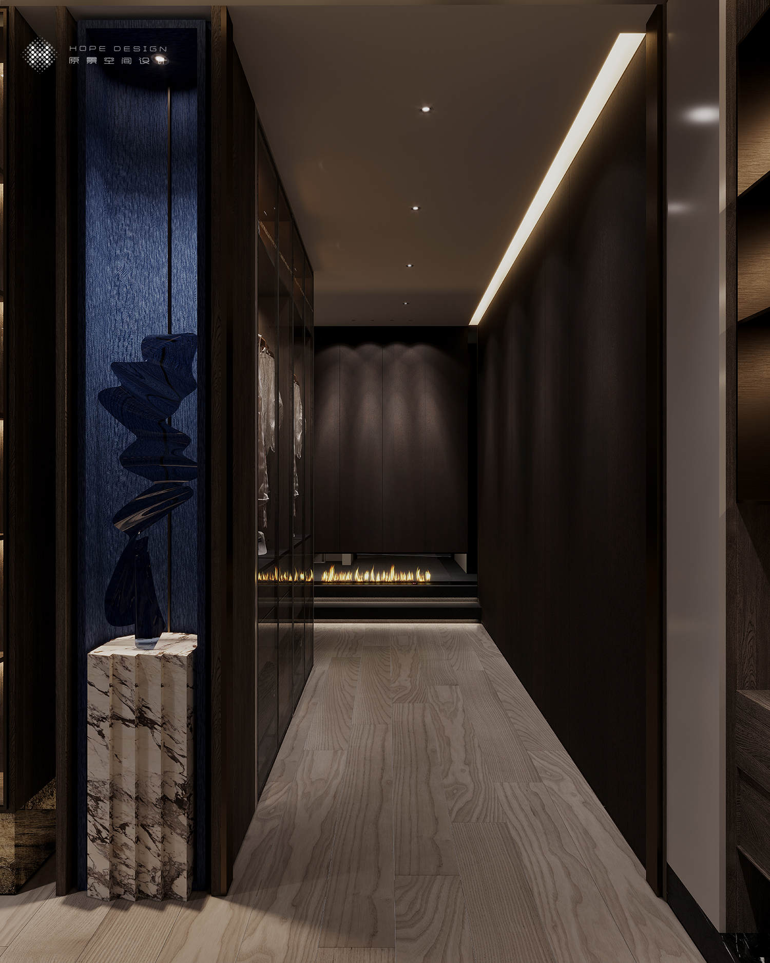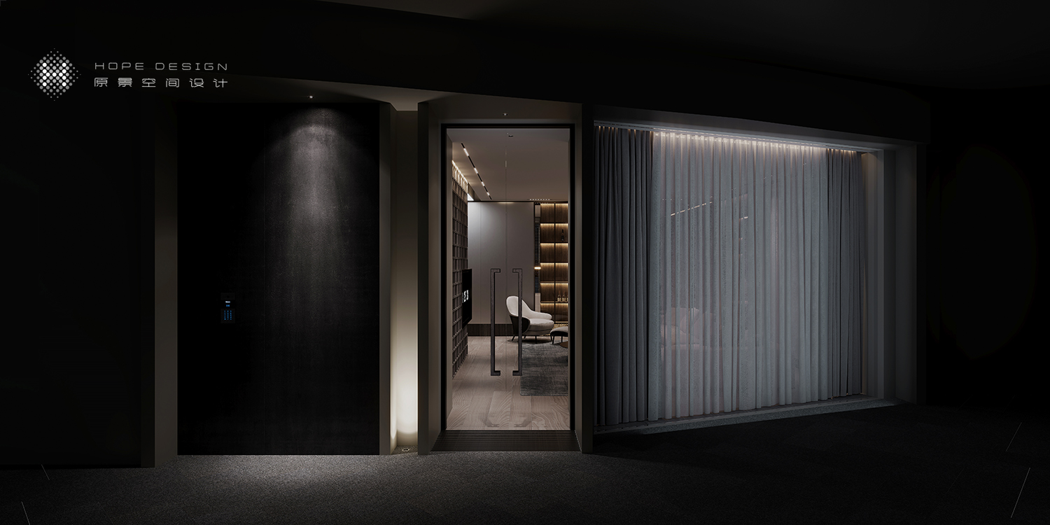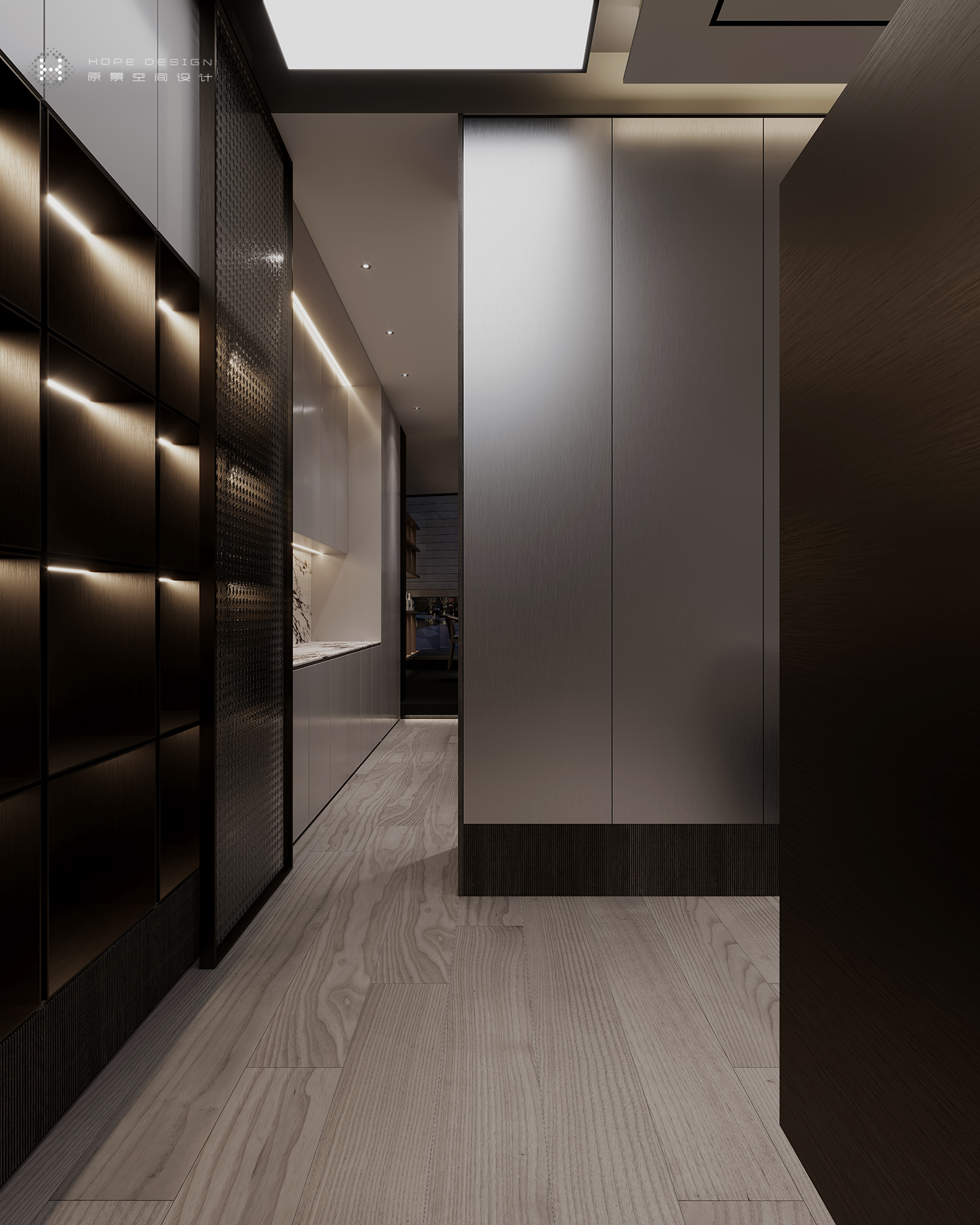 置身廊道空间深古铜色不锈钢与浮雕玻璃的加持,将暖光嵌入,空间结构张弛有度。