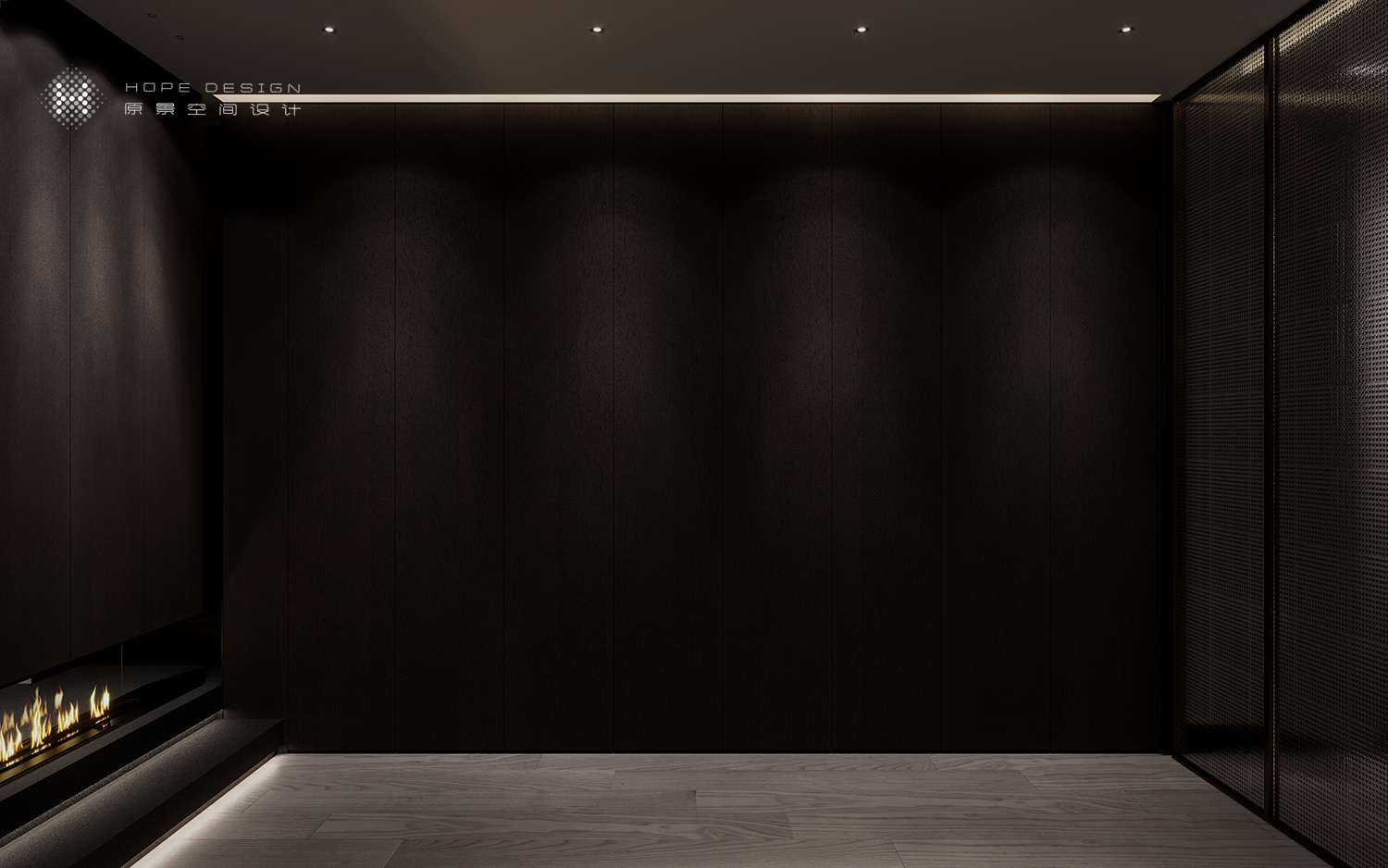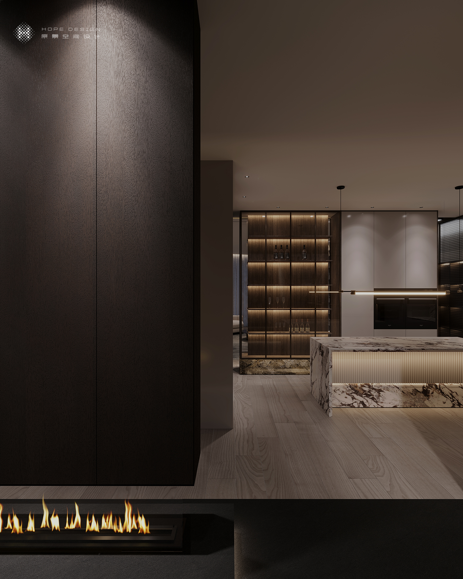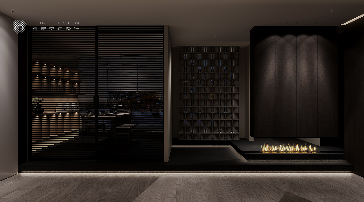 置身廊道空间深古铜色不锈钢与浮雕玻璃的加持,将暖光嵌入,空间结构张弛有度。