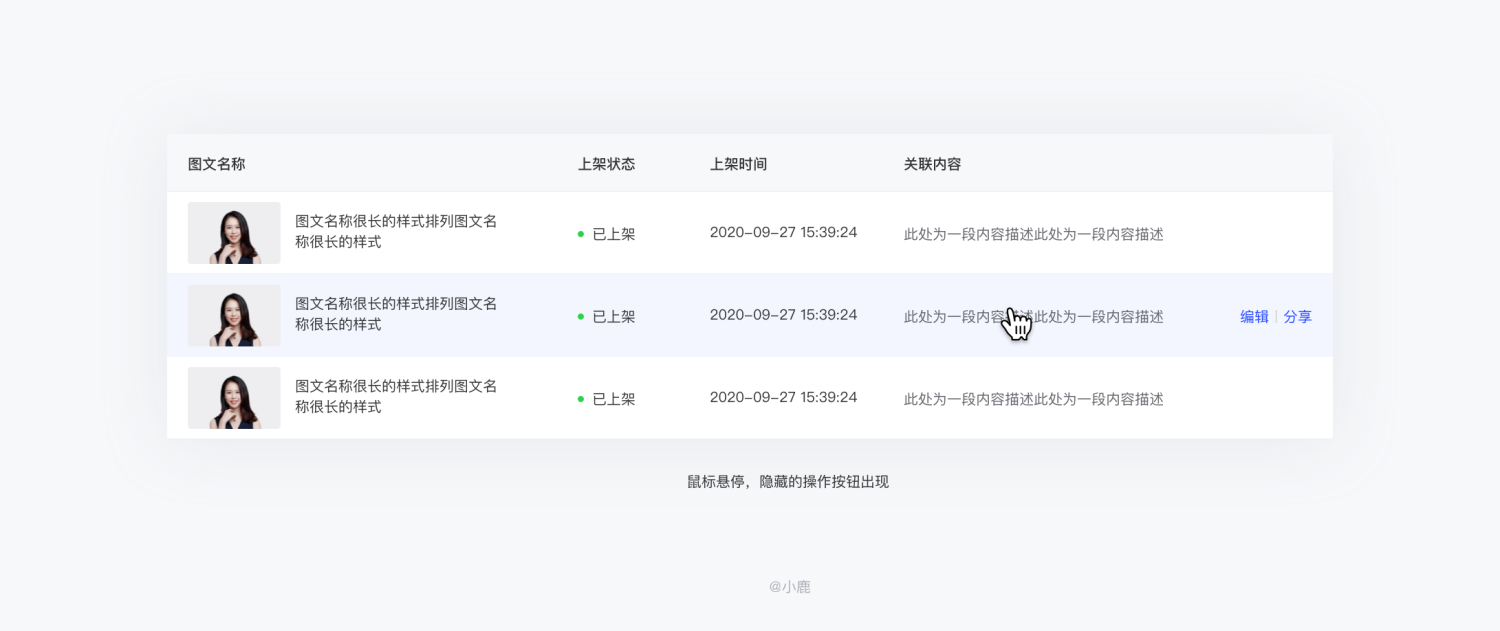 隐性操作:如果行操作不那么重要,或者说行操作过于啰嗦影响用户阅读时,可将所有的操作进行隐藏,当用户鼠标悬停时进行展开所有操作。这种方式能最大程度上满足用户快速查看与编辑的需求,但是在实际使用中,用户的初次使用门槛较高,需要有一定的学习成本。