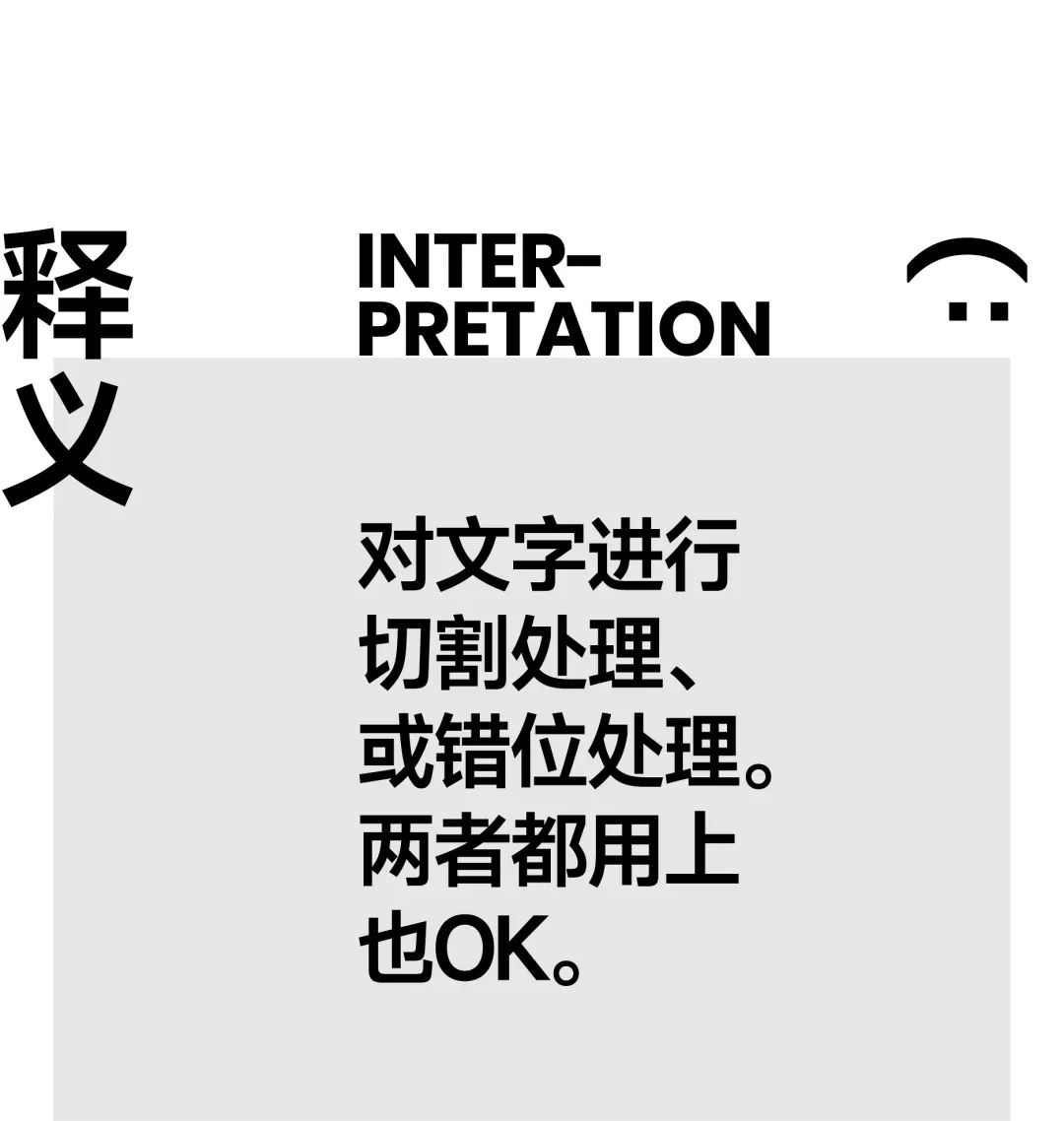 我们可以直截了当地丢掉一些笔画,这样就显得足够⻢⻁了。配上其他文字,在画面中间形成了一块巨大的留白,让这些笔画看上去更像掉落的样子,看上去有点突⺎,却十分合理的创意。