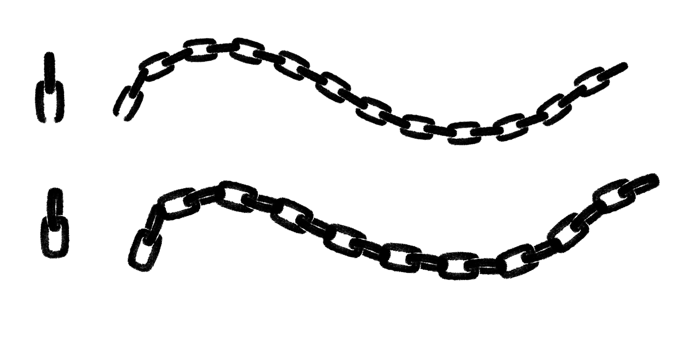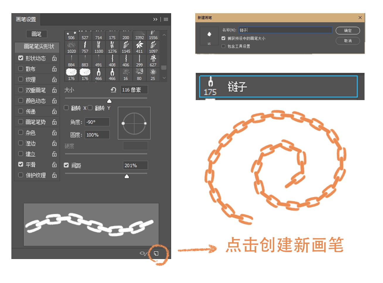 我把这个笔刷叫做方向笔刷。它是由一个基础图案组成,经过画笔拖拽以后,这个基础图案会随着画笔运动的方向而改变方向,画出一条由一个重复基础图案连贯而成的线条。也就是上图呈现出的链条的线条形状。