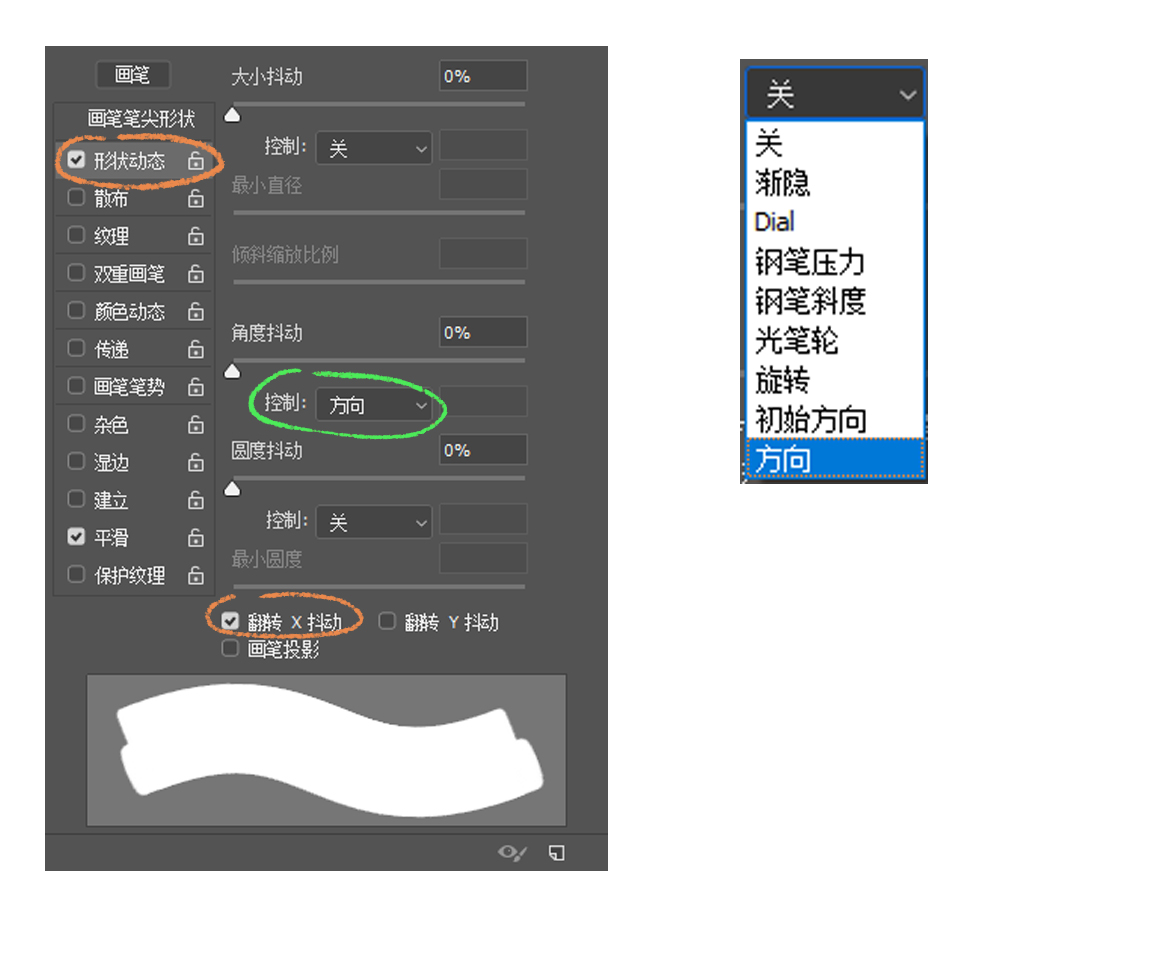 在画笔设置选项框中找到形状动态并勾选,然后在形状动态列表里找到绿圈的控制下拉菜单中选择方向。接着再勾选翻转X抖动。