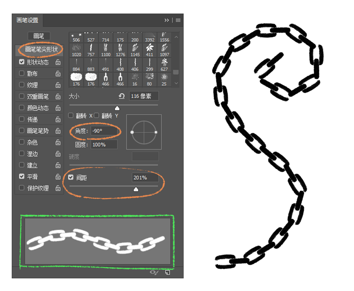 接着,我们来到画笔设置选项框里的画笔笔尖形状选项,把形状的角度改为90°或者-90°,然后调整一下形状的距离。我们可以在画笔预览框(绿色方框)中看到笔刷效果,调整出合适的距离。