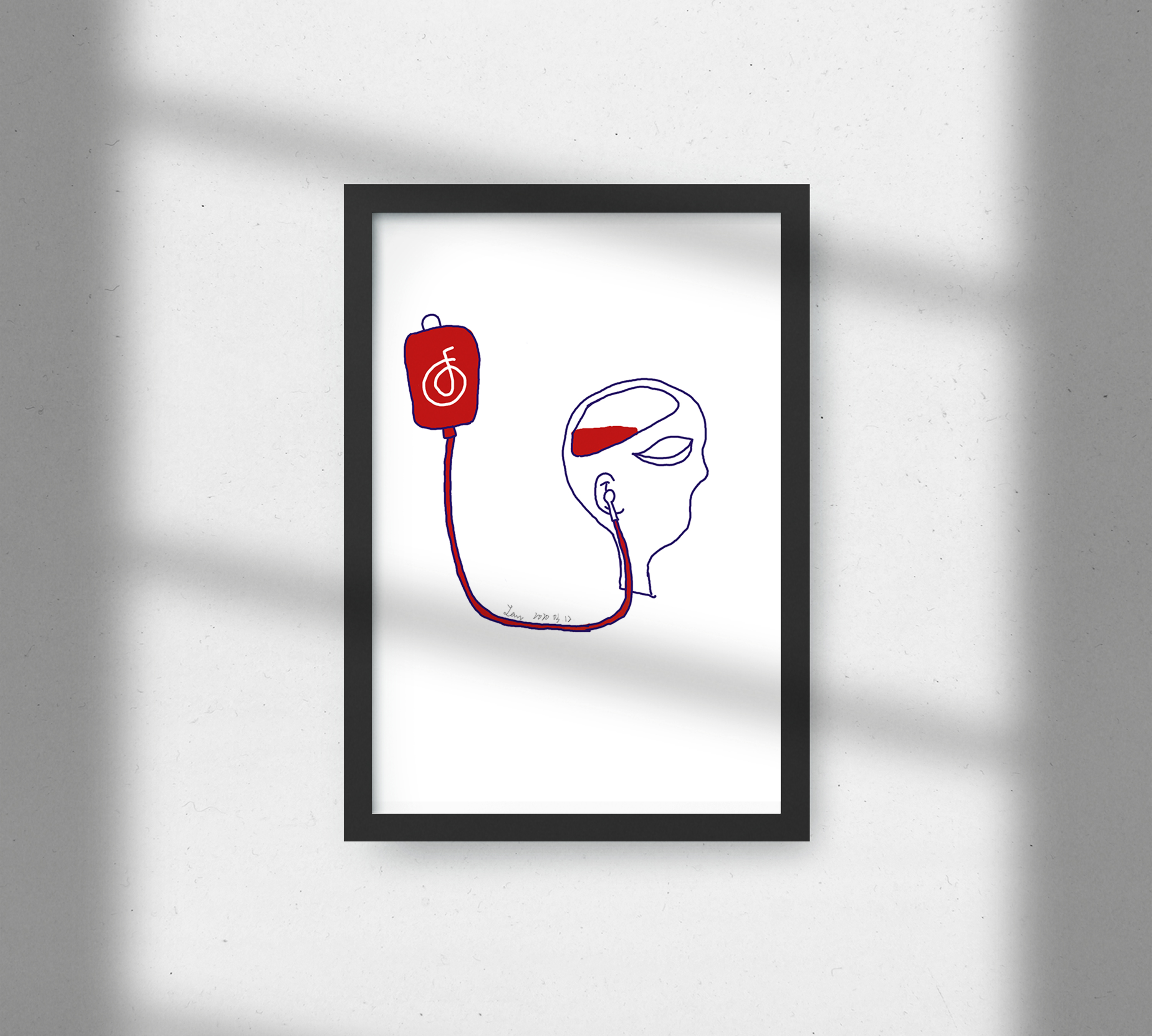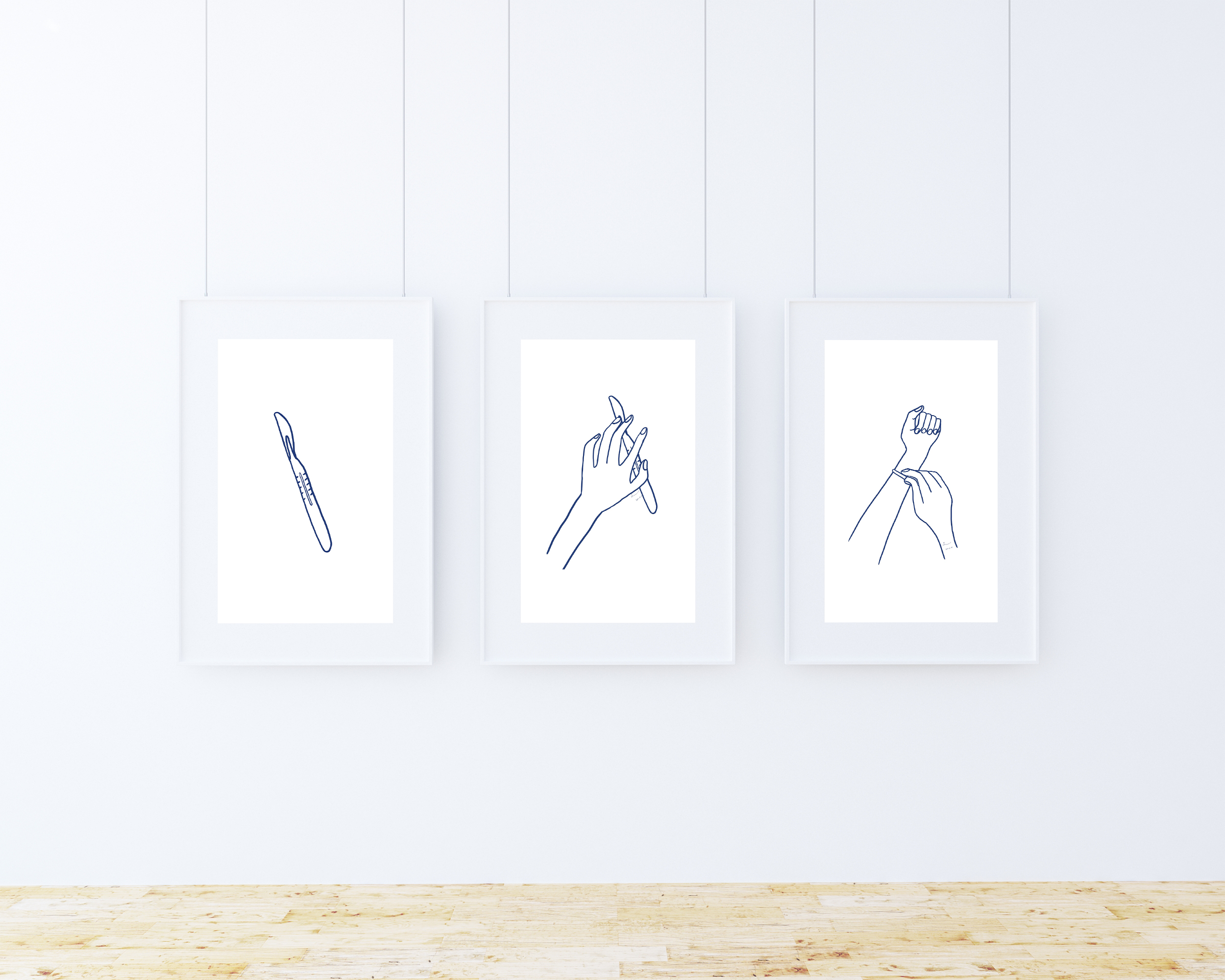 灵感来源:那时候状态可能有点不稳定吧,但是已经很久没梦过伤害自己了。那晚突然梦到自己在一个建筑里面兜兜转转,像是找什么东西。后来进入了一个房间,是一个病房。进去之后,我好像很熟悉物品的摆放位置,径直走到一把手术刀面前,抓起来之后就要往自己手上割,我也不知道为什么要这样做,不过没有流血。醒来之后自己都震惊了。