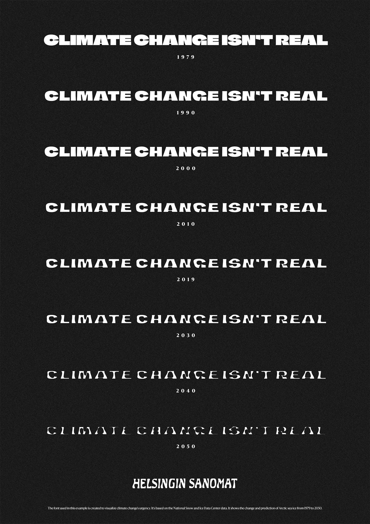 Climate Crisis是一种气候危机的免费开源OpenType可变字体,是当下流行逆反差字体风格中的佼佼者,由北欧最大的报纸Helsingin Sanomat创建,字体的重量响应了1979年至2019年的北极海冰水平以及对2050年的预测。