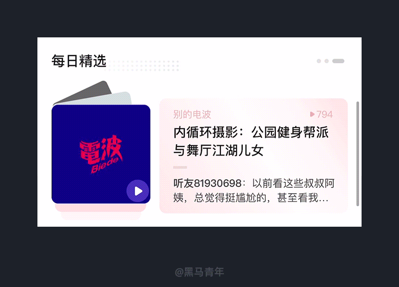最近在喜马拉雅 APP 播客栏目发现了不一样的设计表达,通过专辑封面形式结合辅助解释来设计。不仅结合了自身内容属性,也能在强化视觉感的同时利用文案辅助让解释更加清楚。通过手势滑动进行翻页切换,动态效果也是非常的流畅自然。