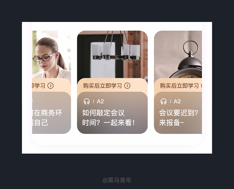通过指向按钮的引导可以让用户抵达需求目的,需要用户进行点击操作。针对横向滑动的交互输出中,在连贯的滑动操作中配合手势交互,随着滑动力度的不同可以实现自动跳转。比如开言英语 APP 课程模块中,针对推荐的课程卡片在向左滑动过程中,随着滑动的程度提示“查看更多”和“释放查看”,实现详情内容的自动跳转。对于需要查看更多推荐内容的用户来说,减少了二次点击的步骤,提高了操作的便捷度和使用效率。