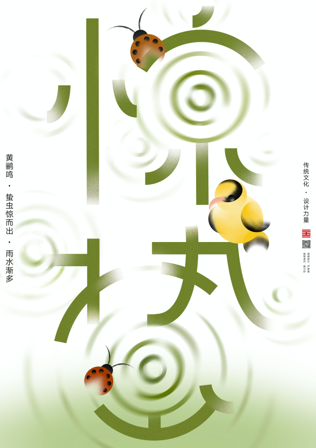 图3:惊蛰二字与春季雨水融合,再以对比色虫鸟点缀,整个画面圆润温和