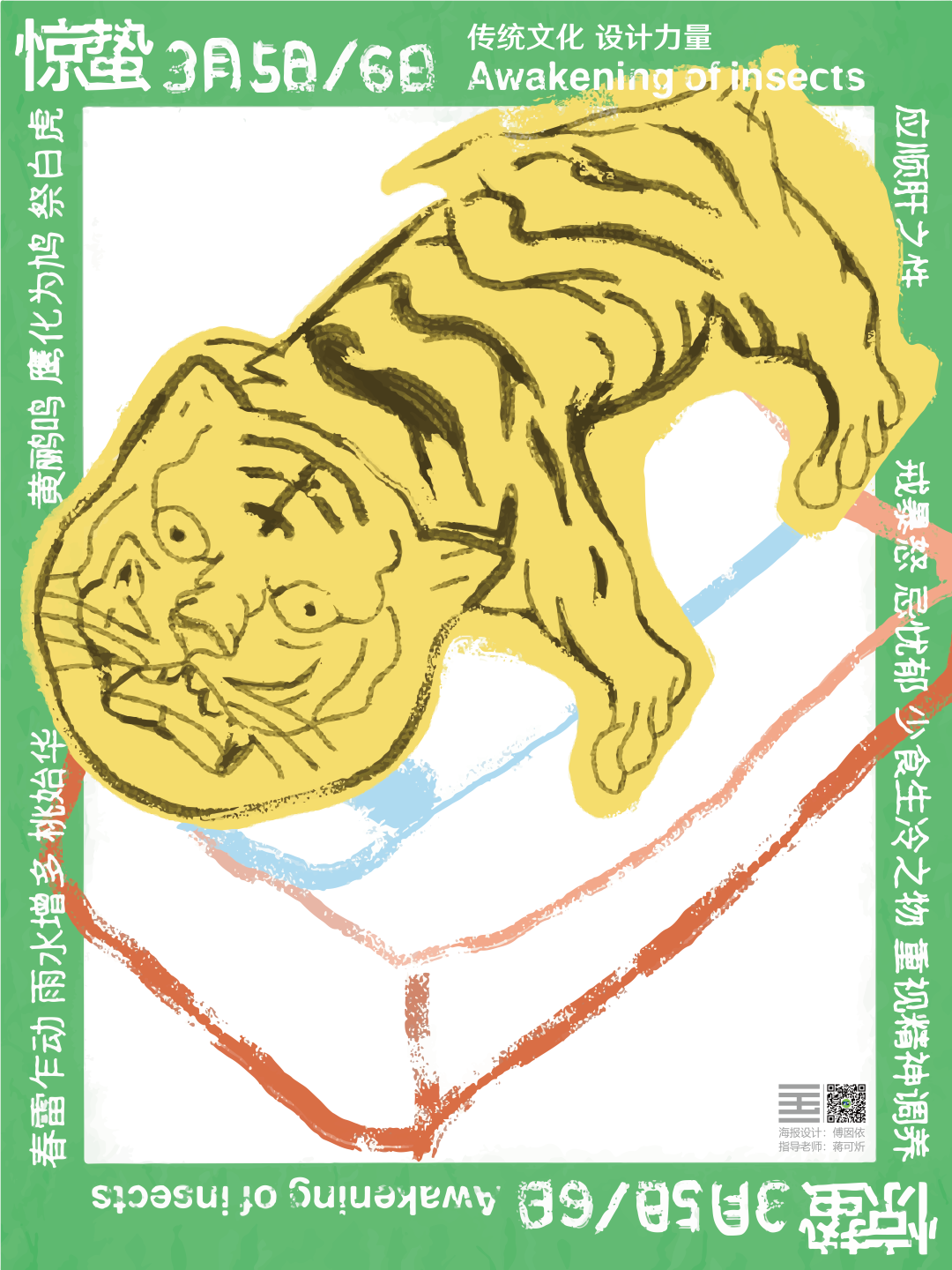 图8:使用绿黄两色的邻近色,一看像小孩子随意画的老虎,其实是以广东习俗——在惊蛰日打小人则须祭白虎为主题创作,整个外框加一圈文字,一种民间符贴的感觉。