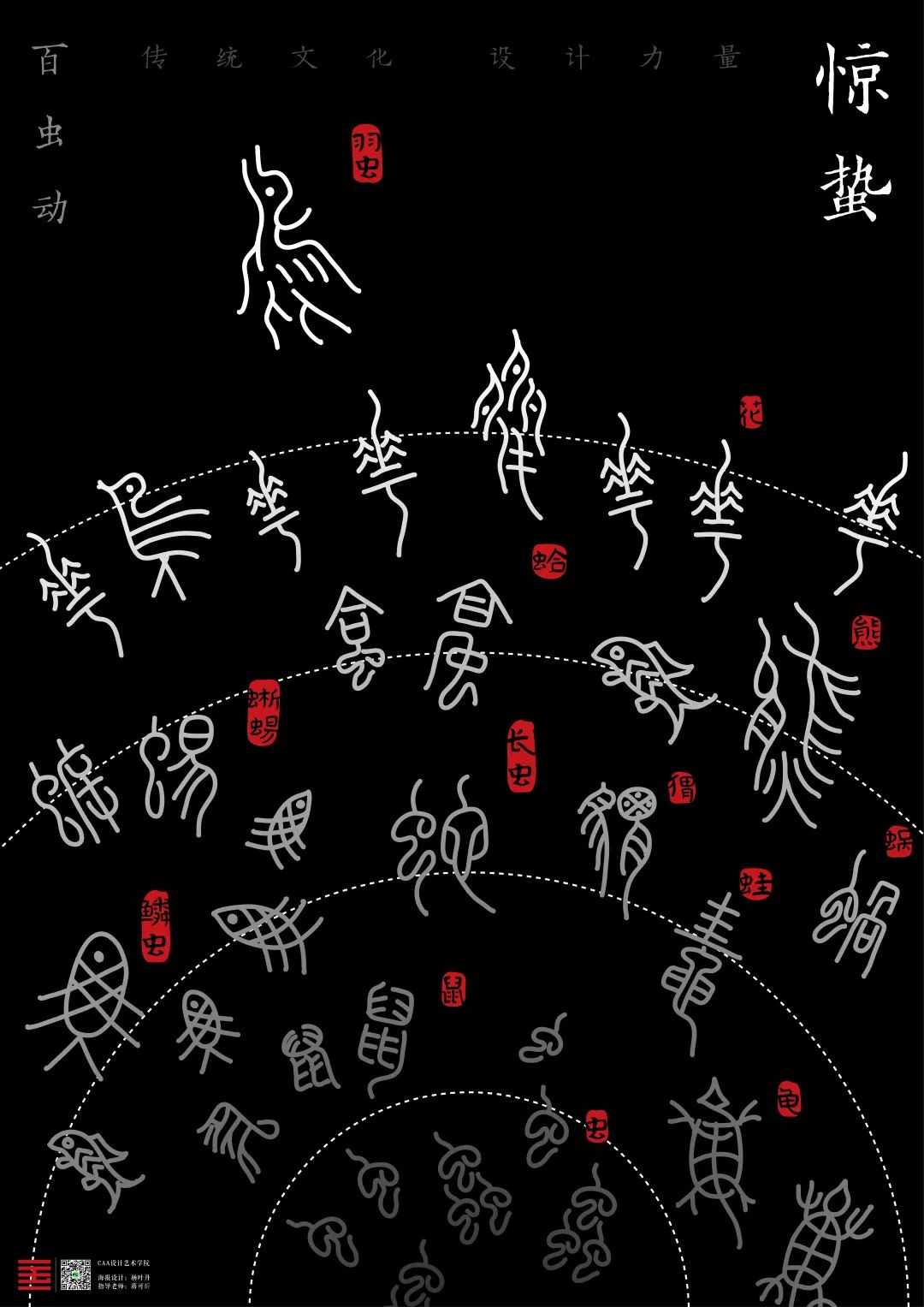 图6:用虫类的小篆字体从底部散开,用中国古文化展现百虫动,再用红色的亮色印章写出虫名,很有创意