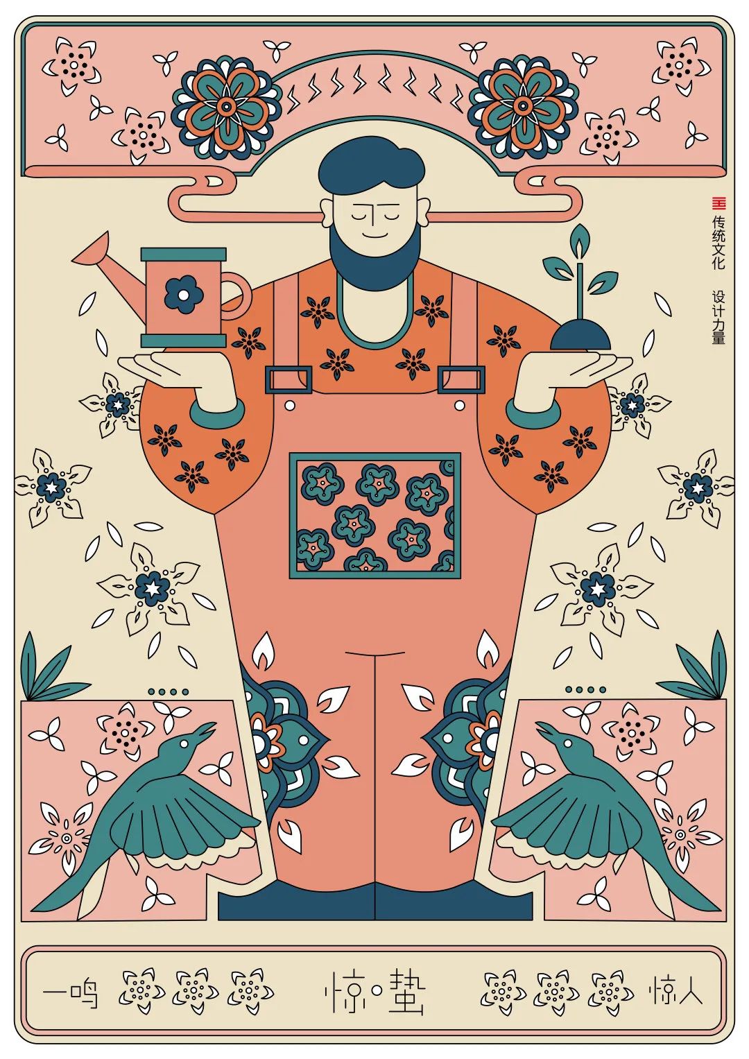 图7:一种现代插画+古典文化的融合,采用对称的手法,粉色+绿色,浇水+植水,散落的花纹,惊蛰后便是春暖花开