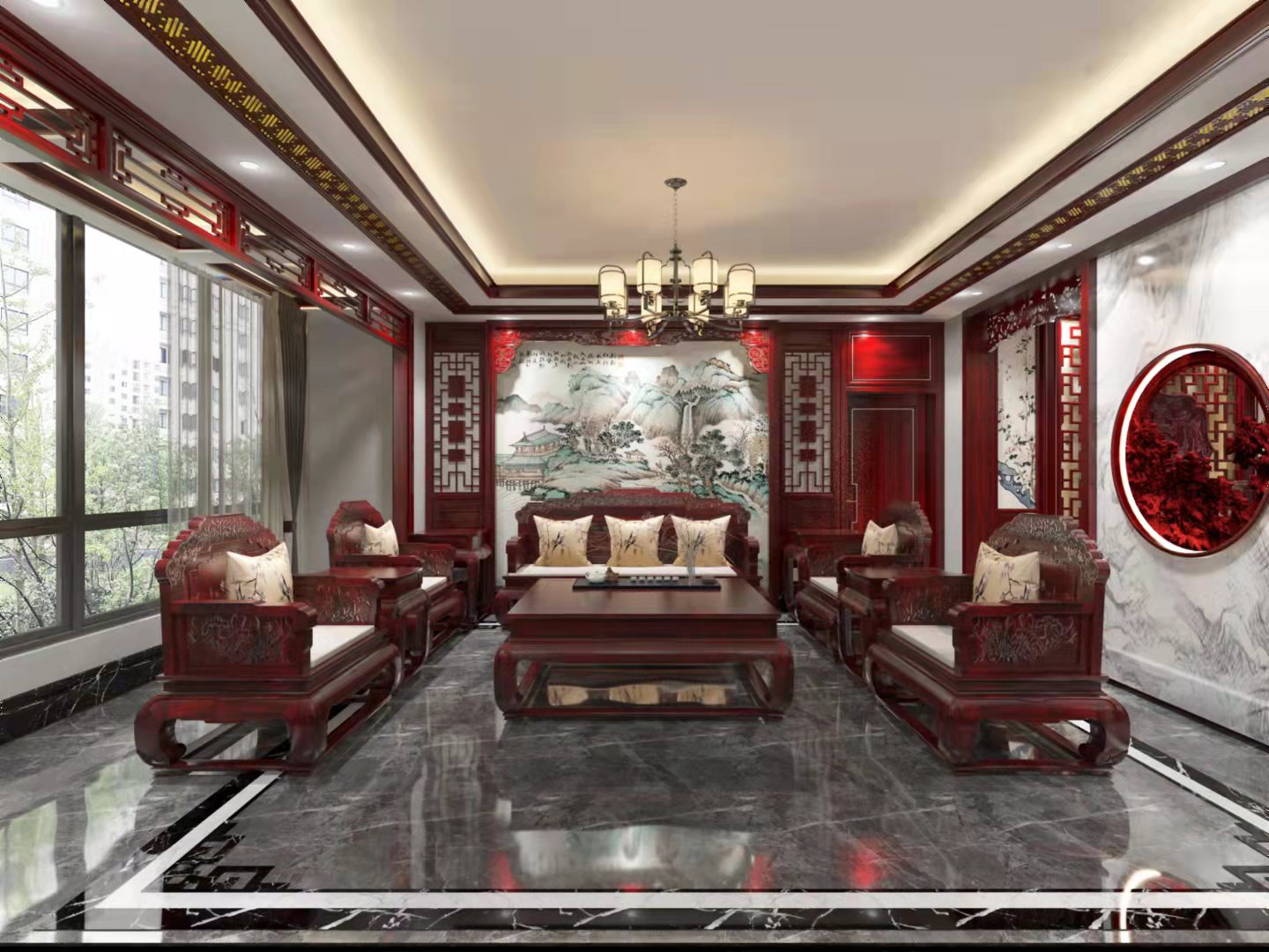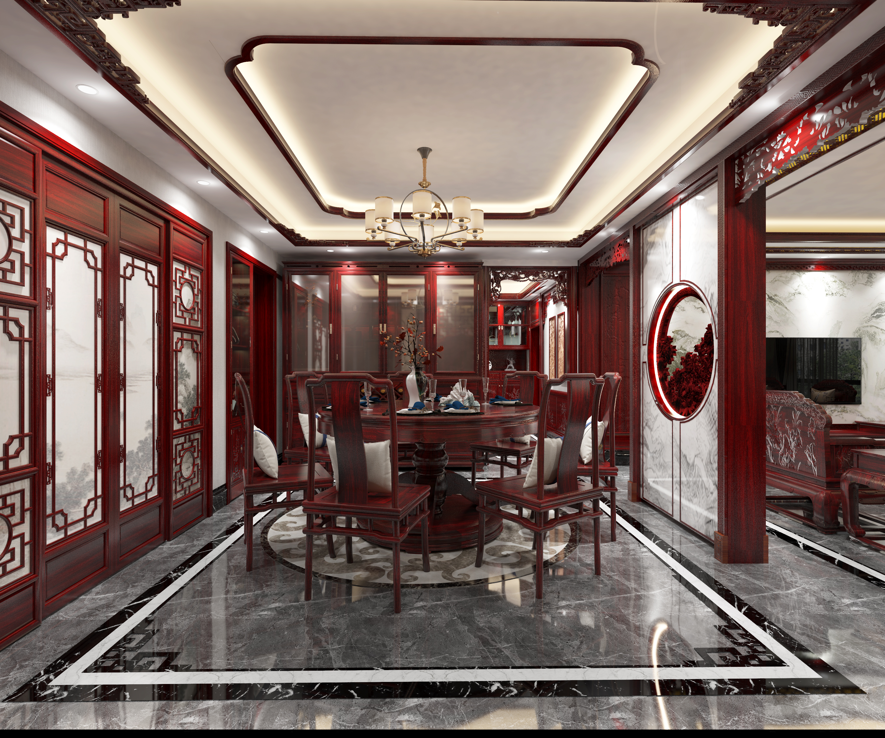 3、门窗和天花。这是中式红木装修风格中的设计重点。中式门窗一般是用棂子做成方格图案或者其他中式的传统图案,一些嵌花什么的,材质用实木,雕刻成各式题材造型,打磨光滑。天花以木条相交成方格形,上覆木板,然后再施以彩画。也可以做成简单的环形灯池吊顶,再用木板包边做框。家庭装修的话就没必要像饭店宾馆等公共场所那样精细的一丝不苟、富丽堂皇,可以根据自身具体条件进行简化,重点突出中式装修风格就可以了。那么就是天花和门窗了。
