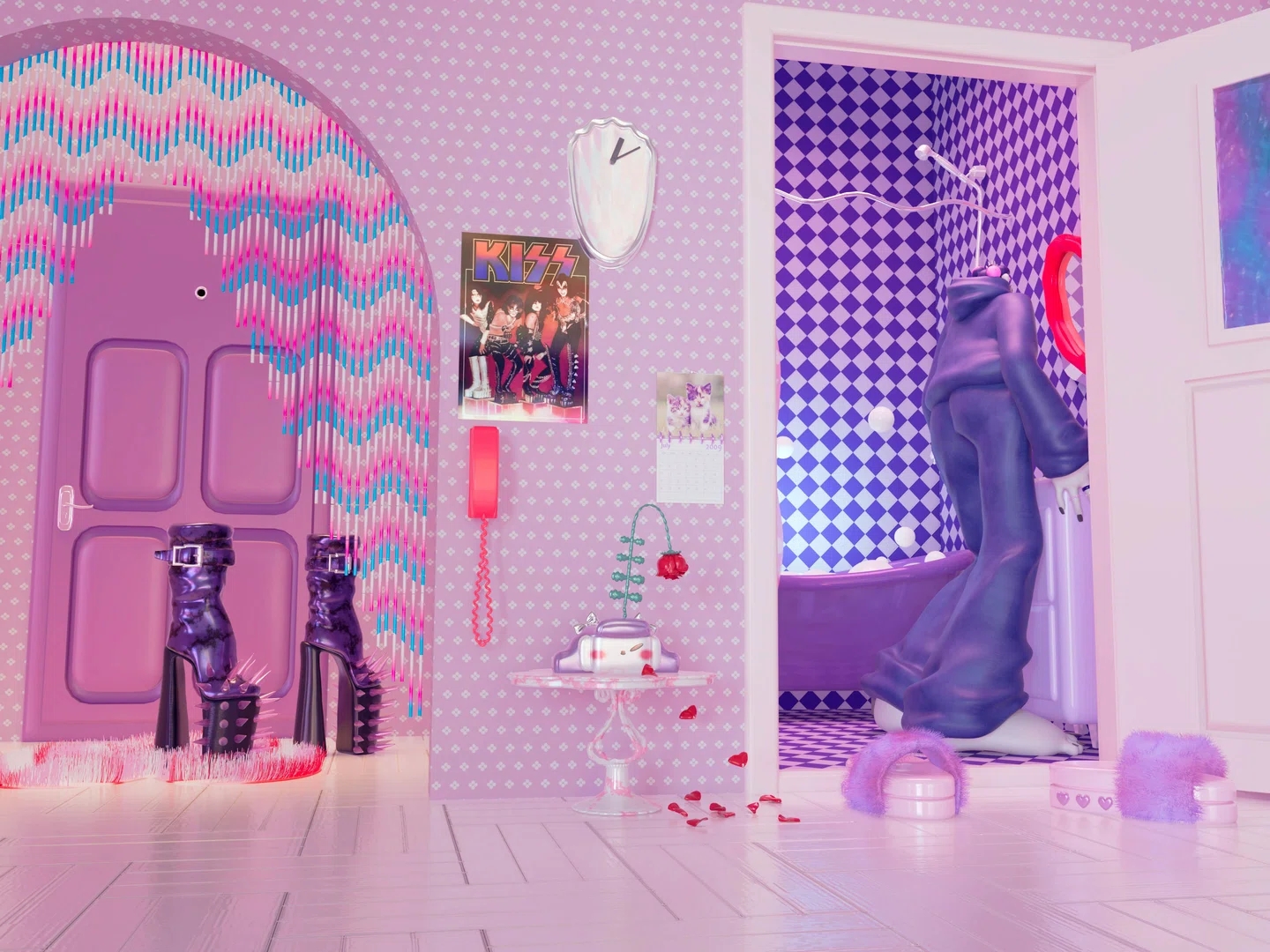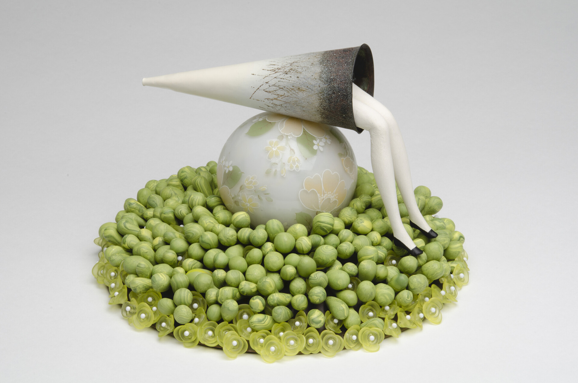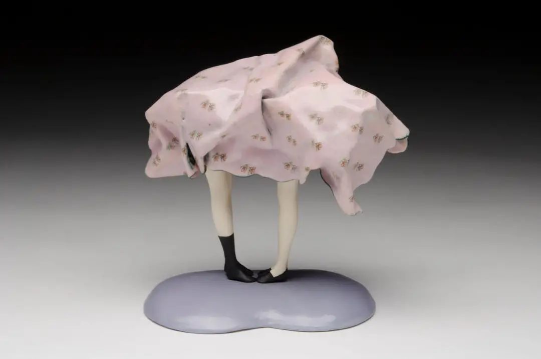 这些古怪的混合体人物,无论是被波尔卡圆点球体覆盖,还是被卡在褶边织物管中,她们都会暂时被环境困住,她们唯一的标志性特征是光滑的黑色高跟鞋或从伪装中脱颖而出的条纹及膝袜。