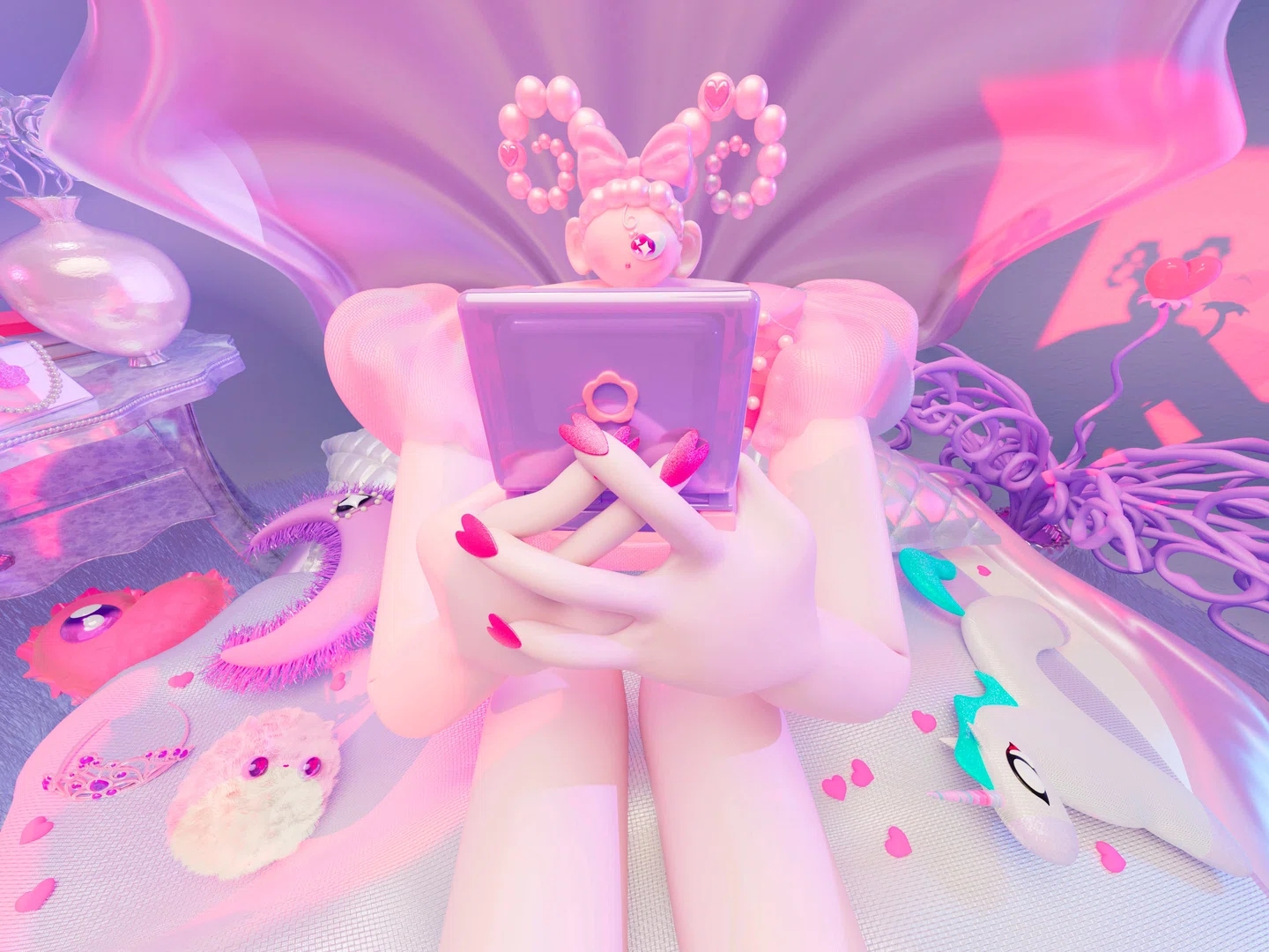 Wei Wu也关注女性议题,但侧重点在女性关系上,即“女性丰富的内心世界和她们复杂的友谊”。这组名为《女性关系》的作品,是她首次从女性的角度出发,通过创造涂有珍珠、宝石泡沫并放置在不同位置的柔和头发上的女性角色来构思这个故事。