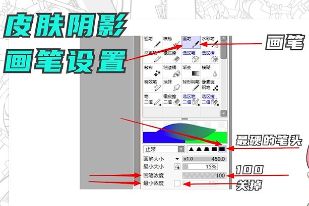 所以我们选用画笔工具,调整设置,笔头用最硬的笔头,然后把画笔浓度调到最大,关掉最小浓度来画。
