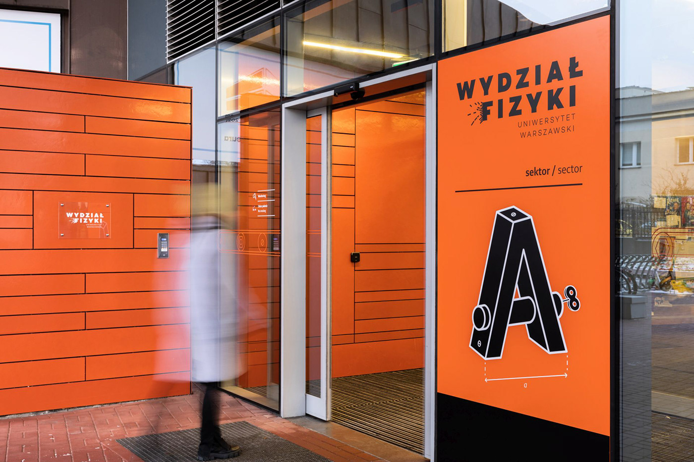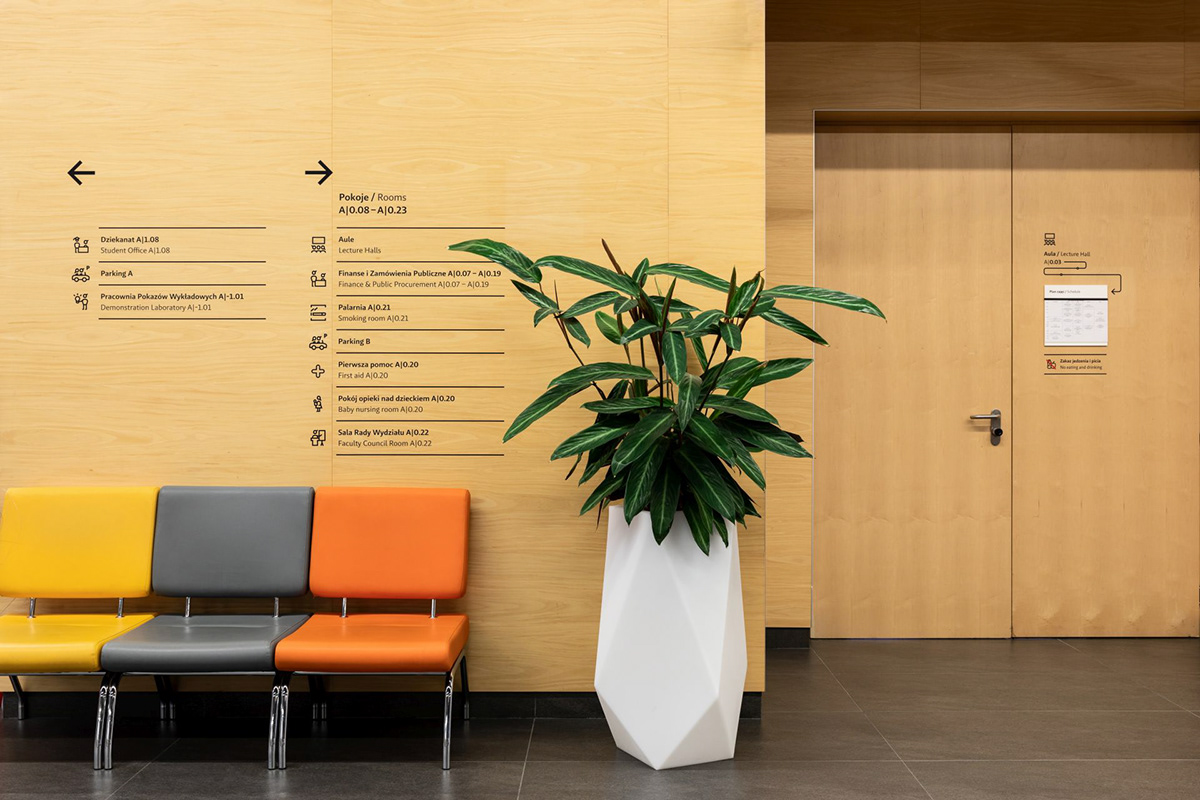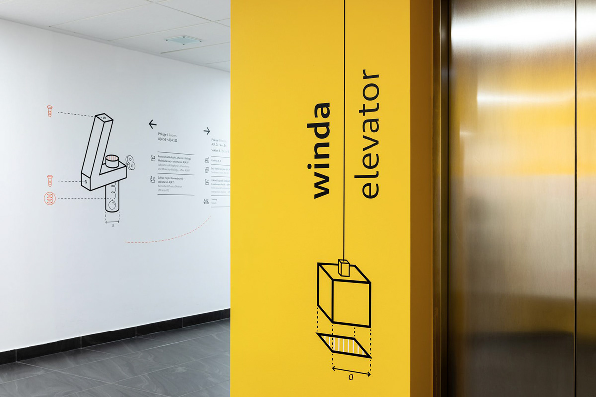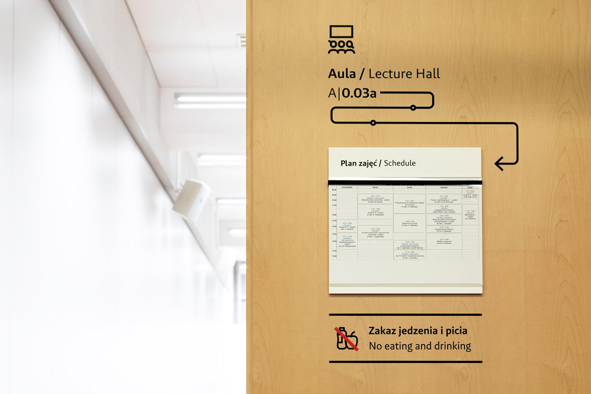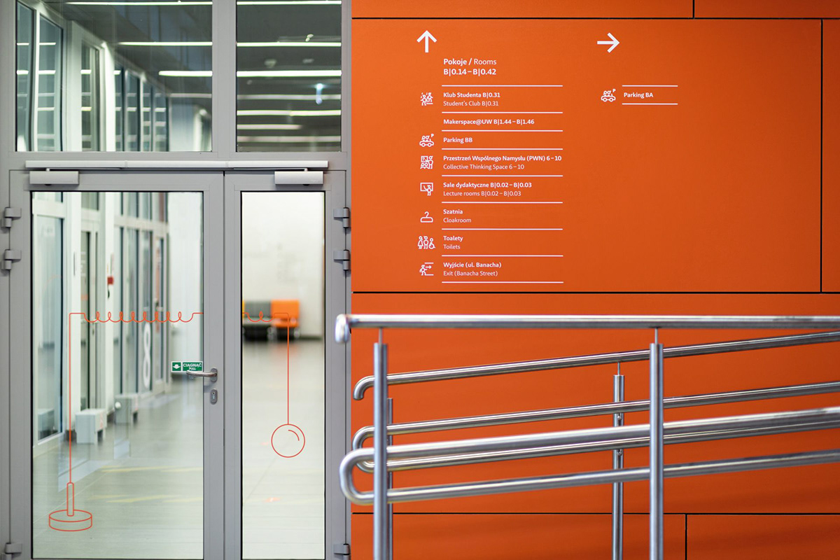 华沙大学物理学院位于波兰华沙奥乔塔区,拥有图书馆、演讲厅、餐厅、办公室和教室等设施,Blank工作室受邀为其进行导视系统设计。