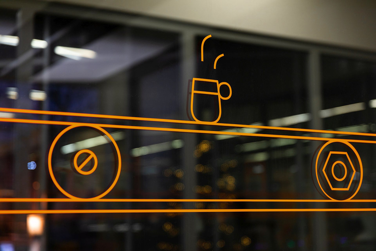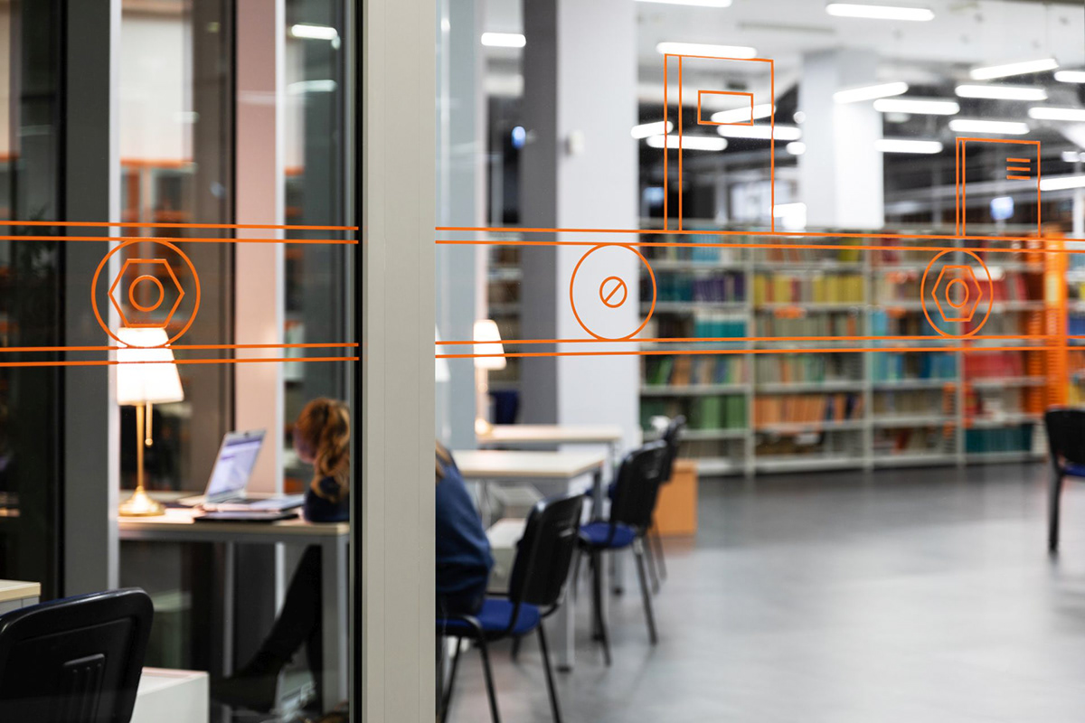 针对物理学院,Blank工作室将图纸元素融入到字体和象形图中,唤起了与物理的联系,增强了信息的传达度。采用黑色、白色和橙色的配色,强烈的对比使信息清晰易读,整套导视系统打造了友好的学习空间。