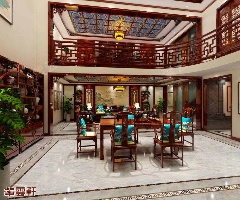 茶室,一套精致茶桌椅放在正中间,茶香配合着淡淡檀木香,仿若走进了仙境一般。挑空式的中式装修设计风格非常阔气,精致考究的多宝阁上摆放着各色珍藏异宝,极具古典魅力。