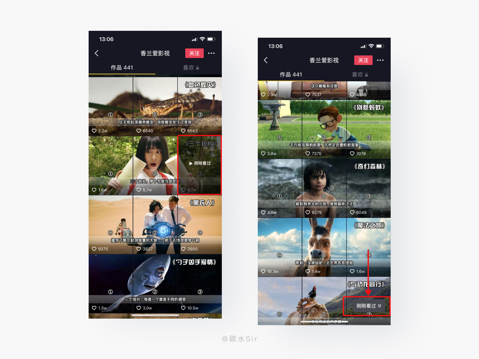 设计方案:当用户对某视频产生兴趣,想看视频博主更多内容,提供点击头像或,屏幕外右滑操作快速进入主页。这时提供两种“刚刚看过”的显示位置。第一种,当视频最近发布,在一屏或滑动一次能显示时“刚刚看过”会显示在视频顶层,并且文字下方黑色遮罩用来提高文字识别,与其他视频做区分。让用户清晰看到。