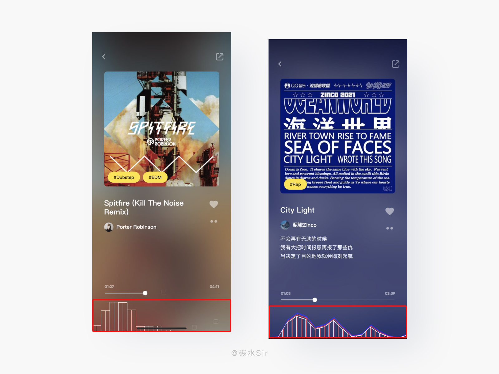 设计方案:「MOO音乐」潮流、偏向小众、再打造更纯粹的音乐世界。所以风格上看不到传统音乐的影子。正因如此,在播放页底部,加入音频波动条,与音乐同步起伏,营造氛围,充满个性。给用户带来双重享受。「彩蛋」:不同曲风的歌曲,底部音频条样式也不一样,这样可以提升神秘感、给用户带来探索的机会。
