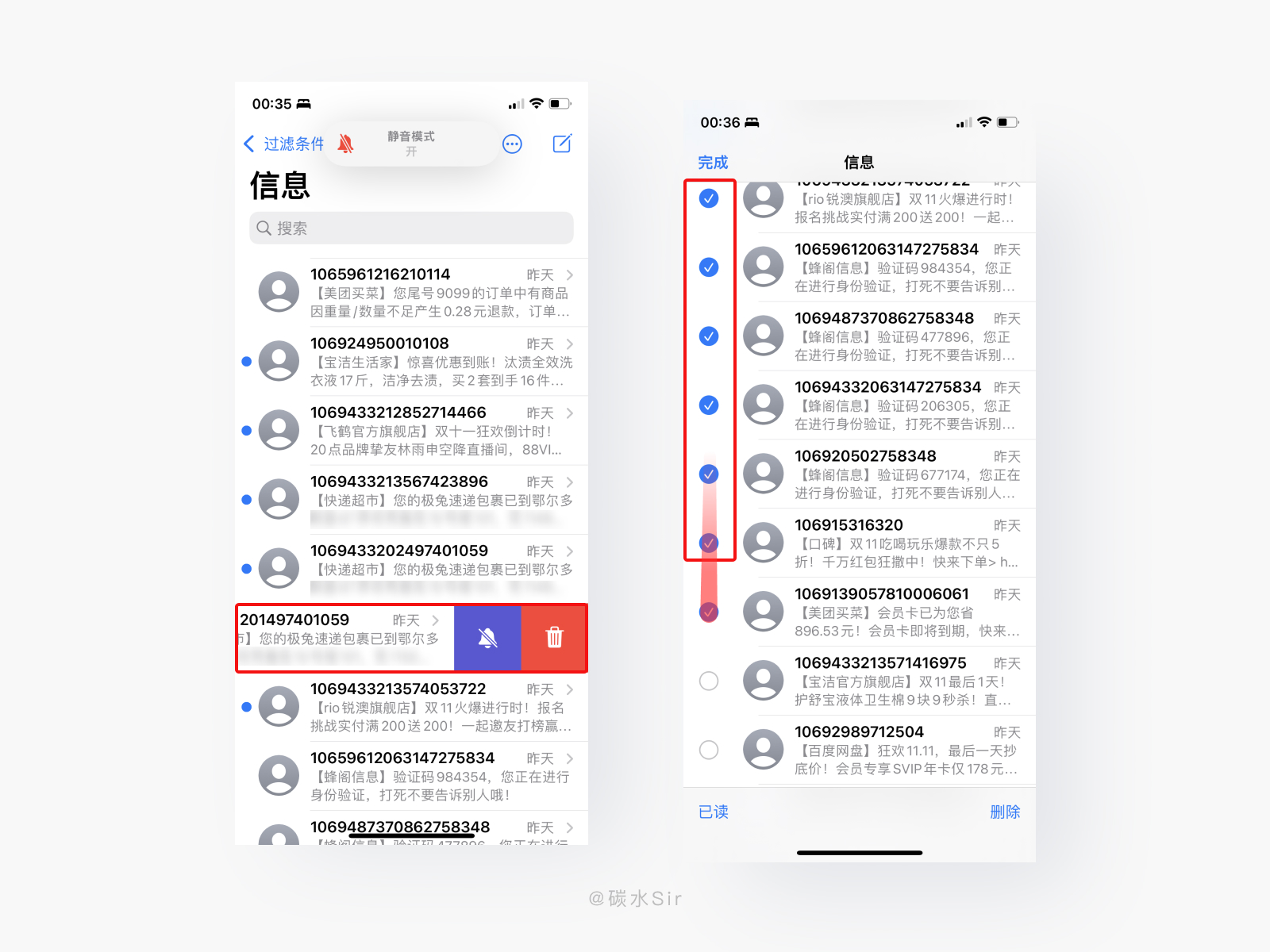 设计方案:在「iPhone信息」中,针对单个信息左滑删除。针对多条信息可通过右上角「更多」-「选择信息」进入批量选择状态,此时会有两种交互手势:一种可逐个点击选中,适用于间隔信息的选择,第二种可在左侧「未选择按钮」长按并下滑进行批量选择,值得注意的是当手势滑动到标签栏时,信息列表会默认向上滑动,继续执行批量选择,然后可针对所选信息进行「已读」「删除」操作。