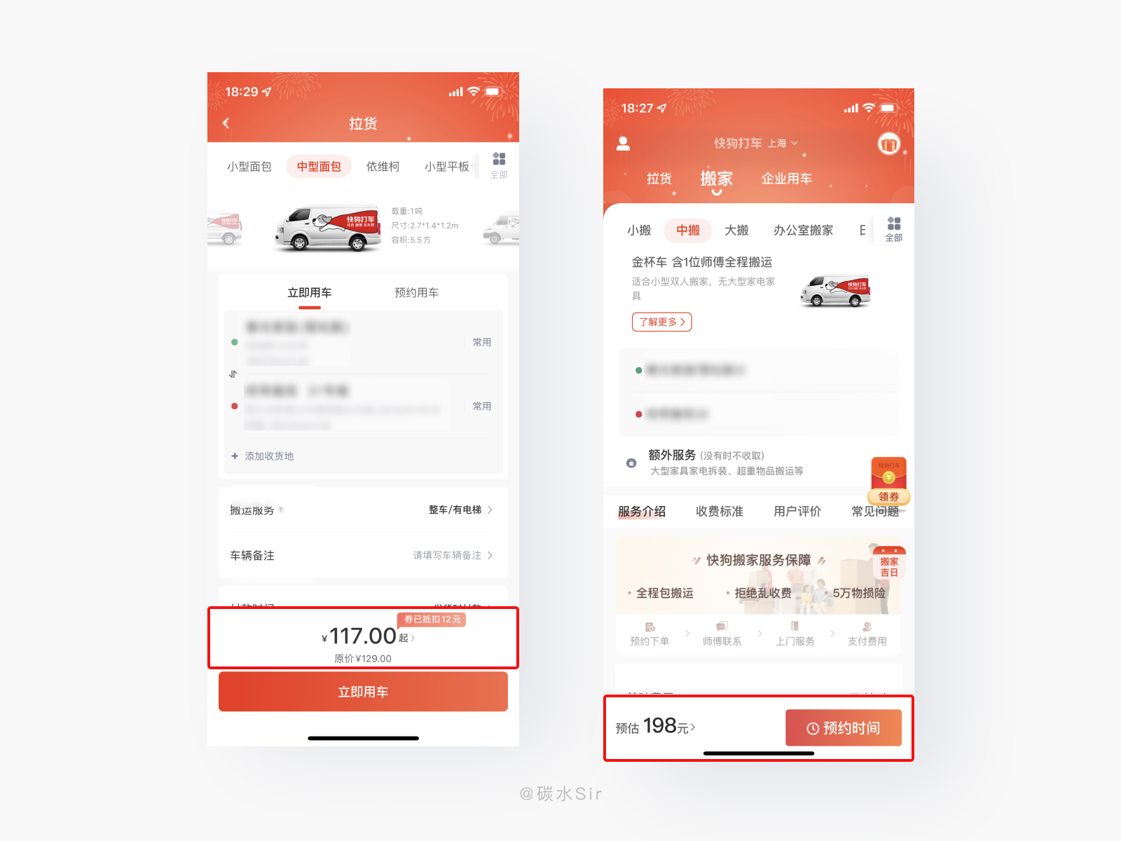 设计方案:拉货,搬家两种类型都提供搬运服务,且都有搬运价格明细。针对拉货需求的用户不一定需要两边都搬运,这里能选择单边搬运或全程搬运。对于搬家来说,选择搬家服务,默认就是要全程搬运的,价格明细只有总计。按需选择。
