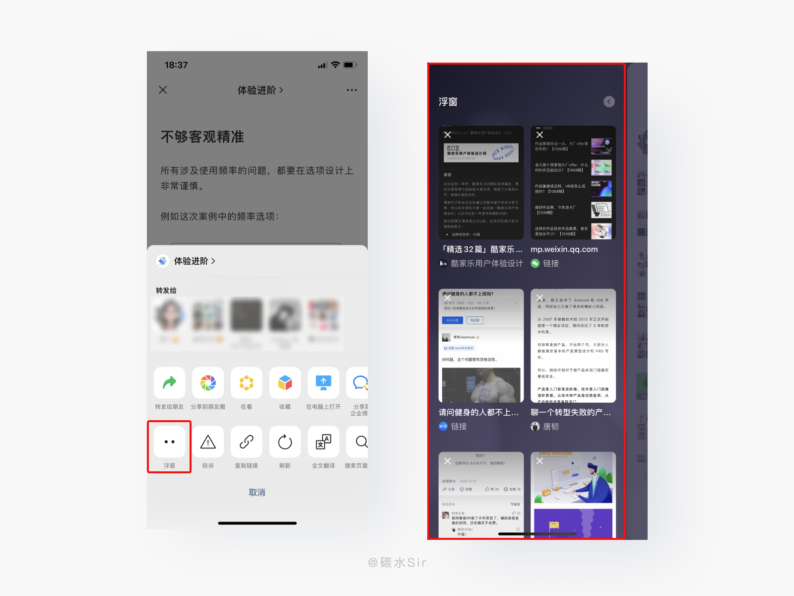设计方案:当阅读公号文章或其他外链网站时,可点击右上角更多按钮,点击「浮窗」自动收入首页浮窗中。可通过右滑查看浮窗内已添加的内容,选择对应文章进行继续阅读。
