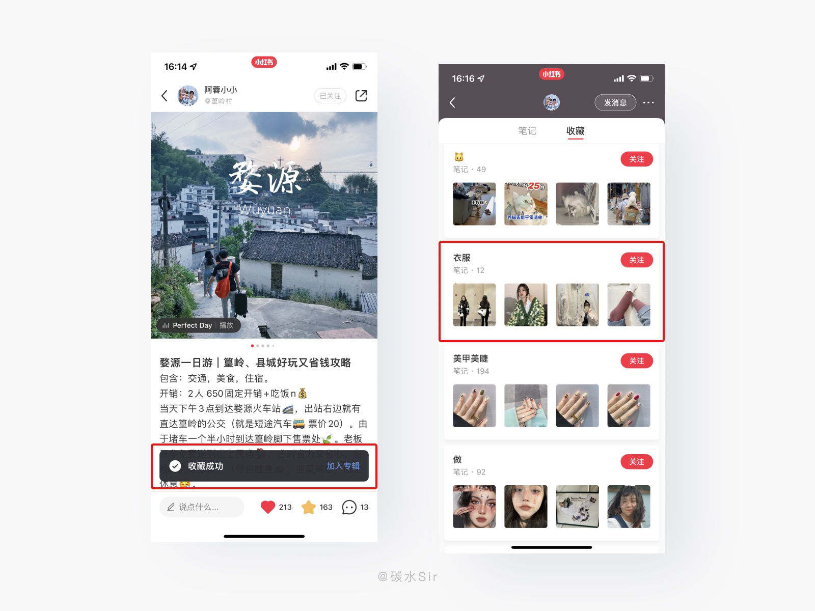 首先收藏的笔记内容是为了一个共同目标(美妆、穿搭、护肤、做饭等),笔记作者各行各业描述的角度不同,但最终能帮助我达到目的。就像音乐专辑,一个专辑能出版取决于歌手、调音师、出品人、发行社等等共同努力。说回来这样布局可以最大化的管理查看收藏的笔记内容,提高用户回看笔记的效率。