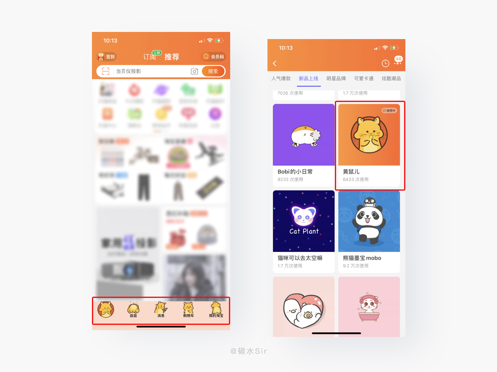这些主题大多都是动物IP,对用户来说接受度更高,童趣可爱的形象,会激发用户使用操作。同时在使用过程中,由于用户经常使用,「淘宝」底部Tabbar基本形成基本认知,不用细看也能分清楚对应模块类别,「主题换肤」的使用不会给用户带来学习或认知成本的增加。相反,会给用户带来使用体验的升级。