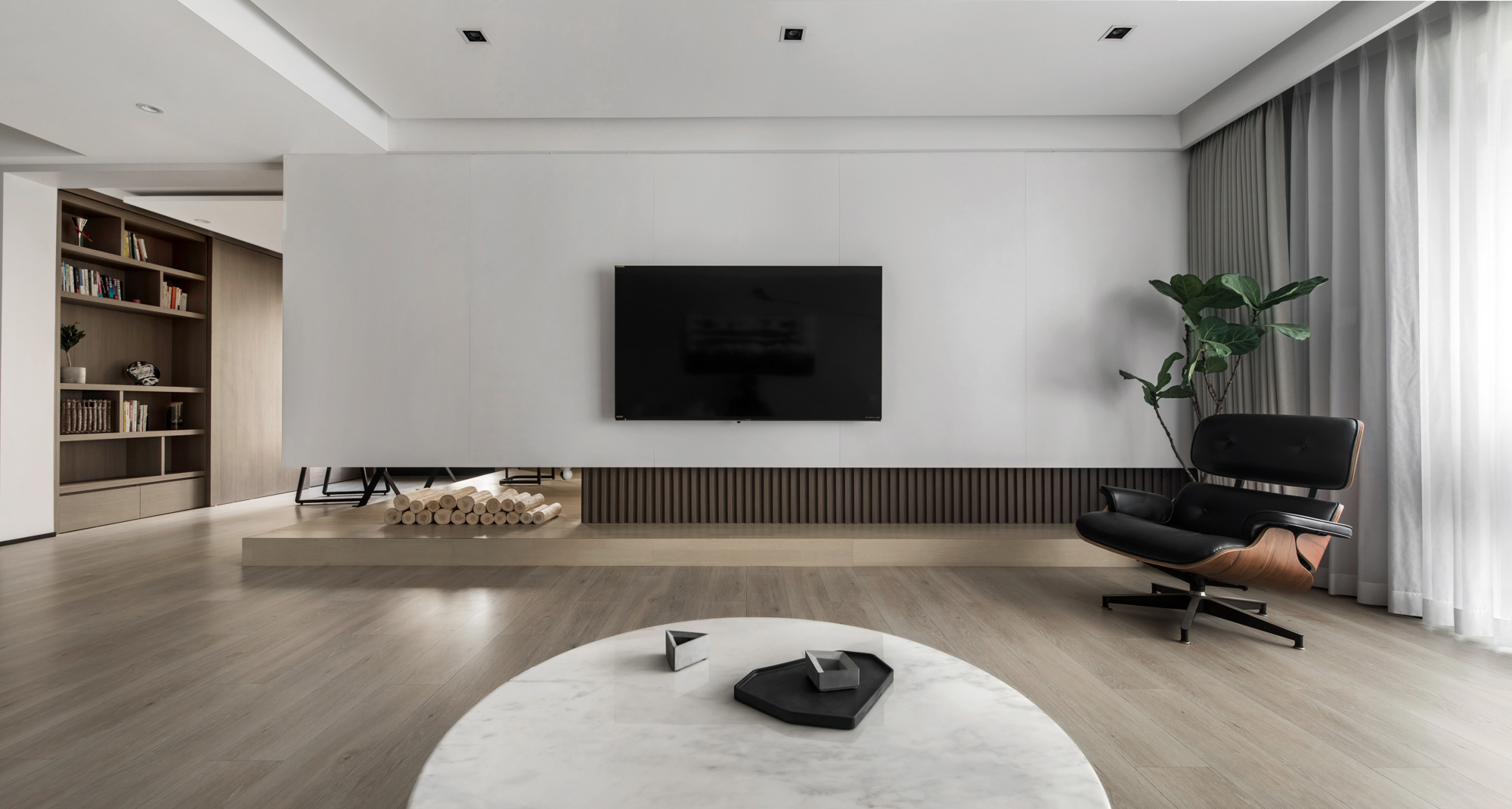 低调平和的大地色增加视觉感的舒适,尽显静谧、质感是空间魅力,与电视背景墙的大片留白对比,明亮舒适的温馨氛围,让客厅简约又通透。