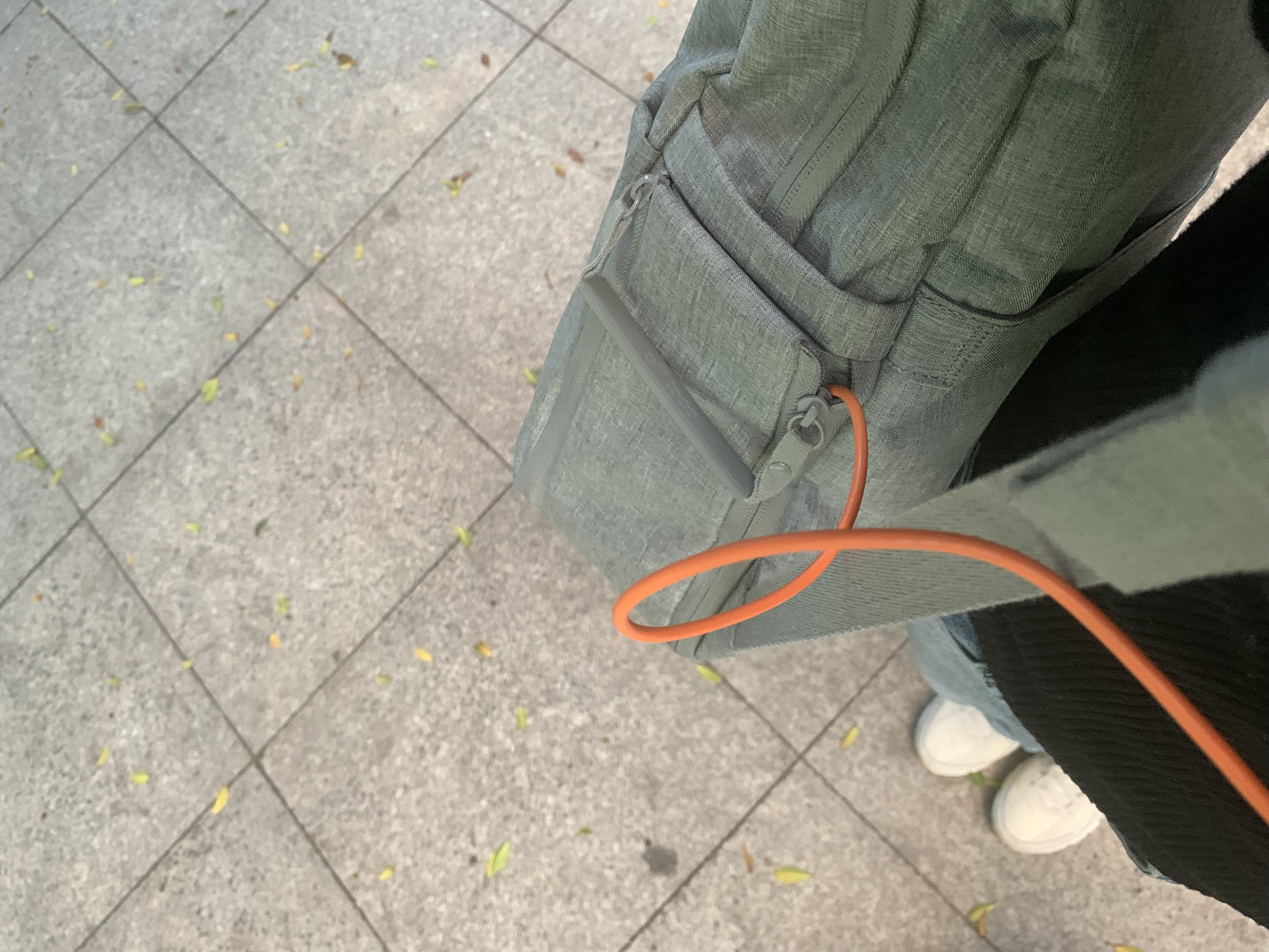 平时我会把充电宝放到相机包里,从侧面拉出来充电也是很方便的,这根长度是1.2米的,使用刚好合适