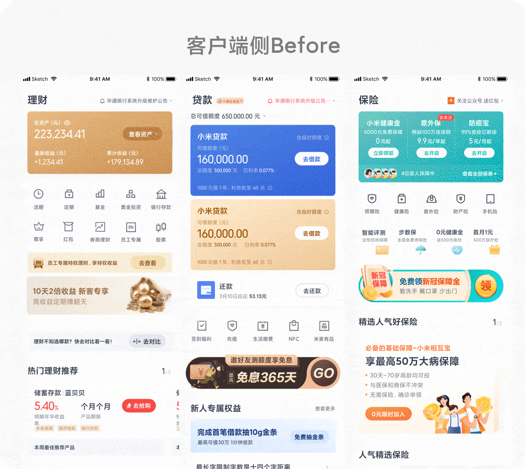 天星金融旗下拥有金融、财富、保险、贷款、钱包5大业务模块,以及多终端的金融产品,随着天星金融的品牌升级,客户端8.0已做初步的融合,目前大部分业务的设计都比较滞后陈旧,并且不同业务之间的设计风格、设计语言不尽相同,产品中存在很多类似的页面结构及组件模块,因而设计系统的构建和金融体系内的横向体验整合已是必然之势。