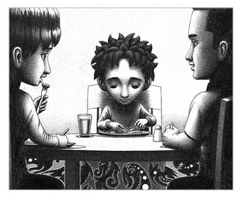 《小小的事》其中的另一个细节,当男孩和家庭一起吃饭的时候,表面上风平浪静,父母并意识不到变化,但是桌下阴影中怪物已经暗藏汹涌。