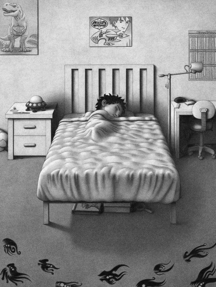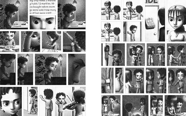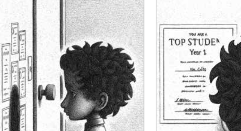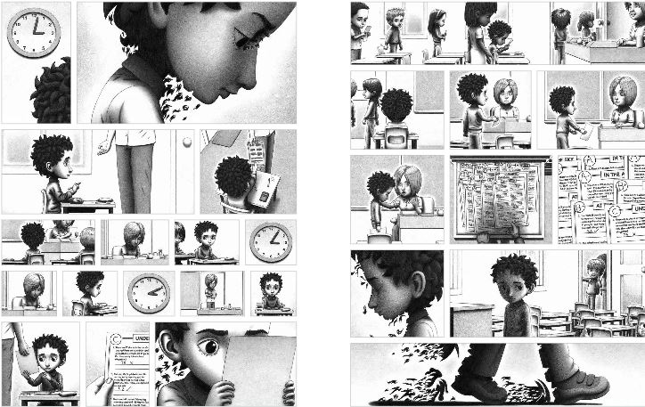 本书如同《抵岸》一样,是一本单色无字图形小说,这本绘本围绕着一个处处不顺心的小男孩展开,他融入不了集体,体育不是他的长项,学习成绩也一直不理想。