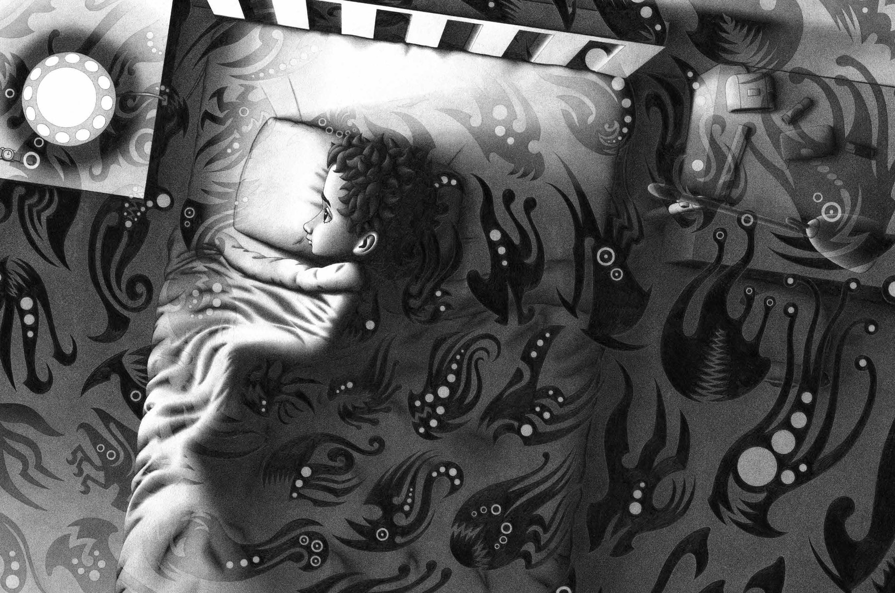在黑白绘本中,“色调”是一个推动剧情发展的重要工具,大家可以看到在涉及到灯光的三幕式结构里,光源的变换是以抑——扬——抑的结构出现的,最后小男孩的床头灯掉落,所有怪物的篇幅变得无比大,姐姐的出现打开了一道亮光。也揭示了故事中解决矛盾的答案——交流与陪伴。