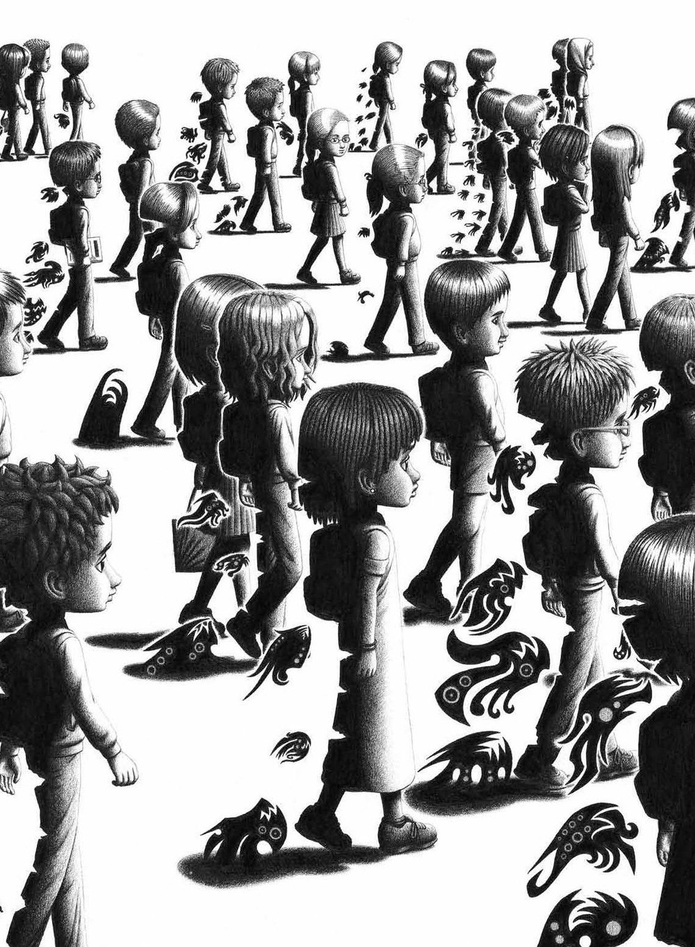 故事的结局,当男孩重新去看这个世界的时候,他发现阳光下很多人的影子里有或多或少的都有一些怪物在伺机而动,这也说明了没有得过抑郁症的人很难理解或意识到这种症状存在的可能性,亦或者说,每个人或多或少也会存在抑郁的情绪。