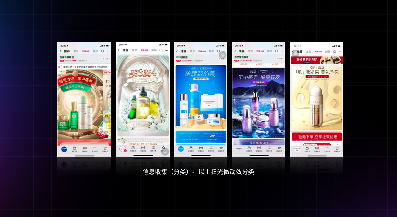 根据收集的内容进行不同维度针对性分析,比如这次活动视觉发现很多品牌用了这种扫光微动效,通过最简单的微动效进行画面光影氛围渲染。