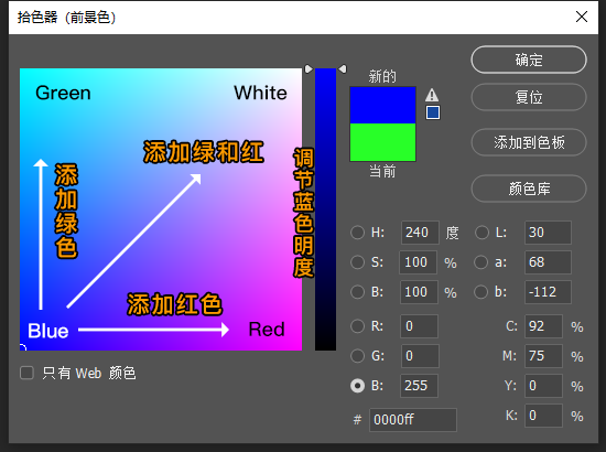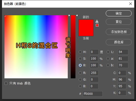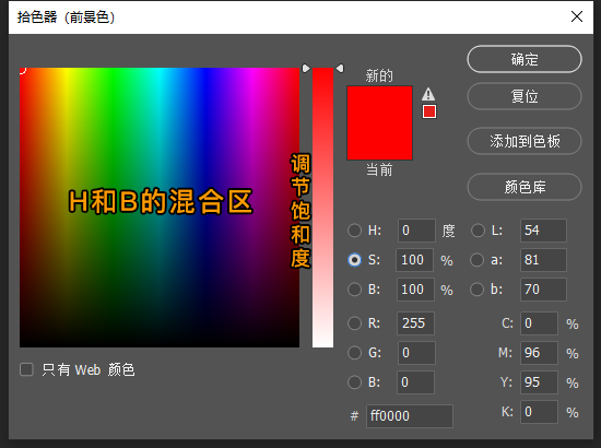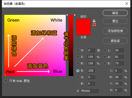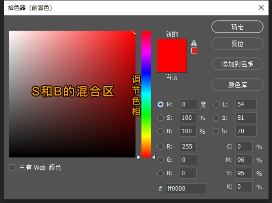 RGB模式:此模式的拾色器也比较常用,红绿蓝三个通道的混合产生不同的色彩,虽然理解不难,但调配起来并不轻松。如上图,比如我们选中红色 (R) 通道,可以这么理解,调色板往上是添加绿色的分量,往右是添加蓝色的分量,滑动条是调节红色的分量,这样理解虽不难,但是我们去调配一个想要的颜色的时候,就很难把握三个颜色通道混合所需要的分量,特别微调的时候也不好掌控。