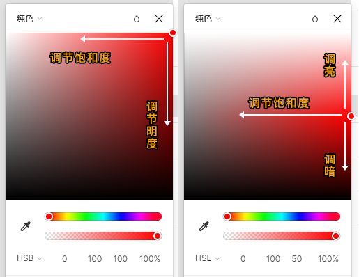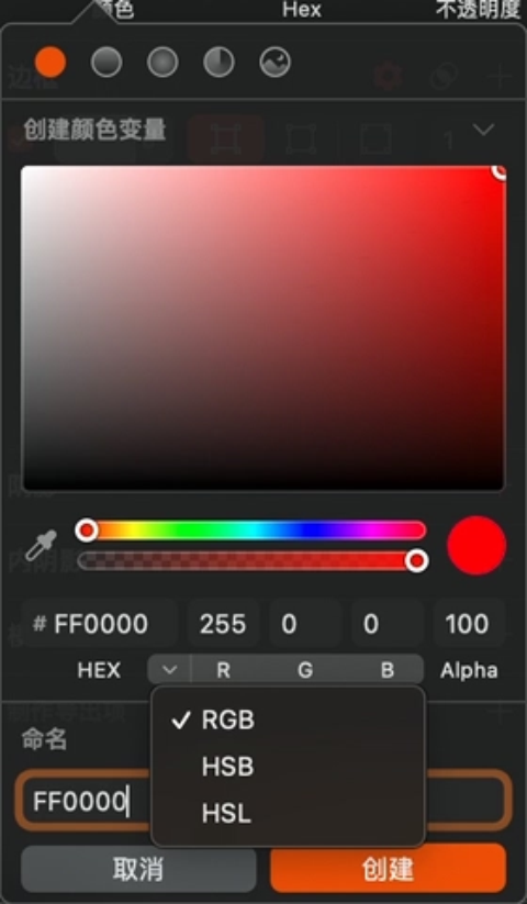 Figma 支持 HEX、RGB、CSS(rgba)、HSL、HSB 模式设置参数,调色板可以切换 HSL 和 HSB 模式,如上图,HSL 和 HSB 调色原理很相似