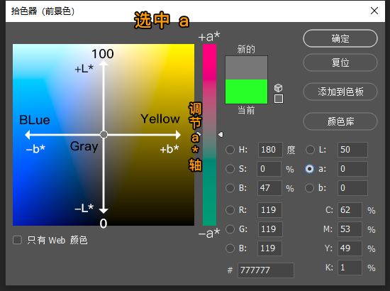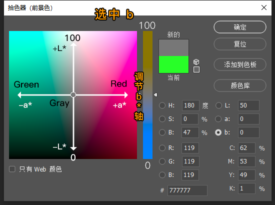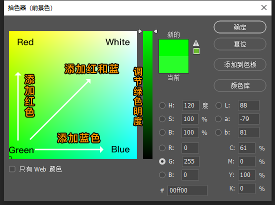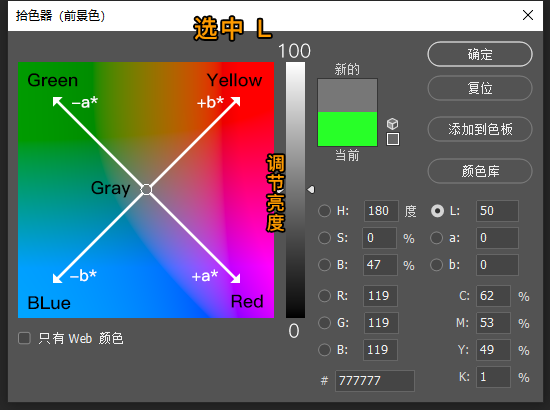 LAB模式:此模式的拾色器比较难理解,设计印刷品的时候可以尝试用这种模式,可以确保色彩的真实还原度。以上的图描述了这种模式的拾色器构成原理,方便大家理解。