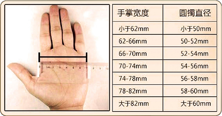 2.手掌宽度是指用直尺测量出来的实际读数,以此相对应的圆镯直径指的是手镯的内径读数。手工测量,会有1-2cm的误差,请以收到实物为准。