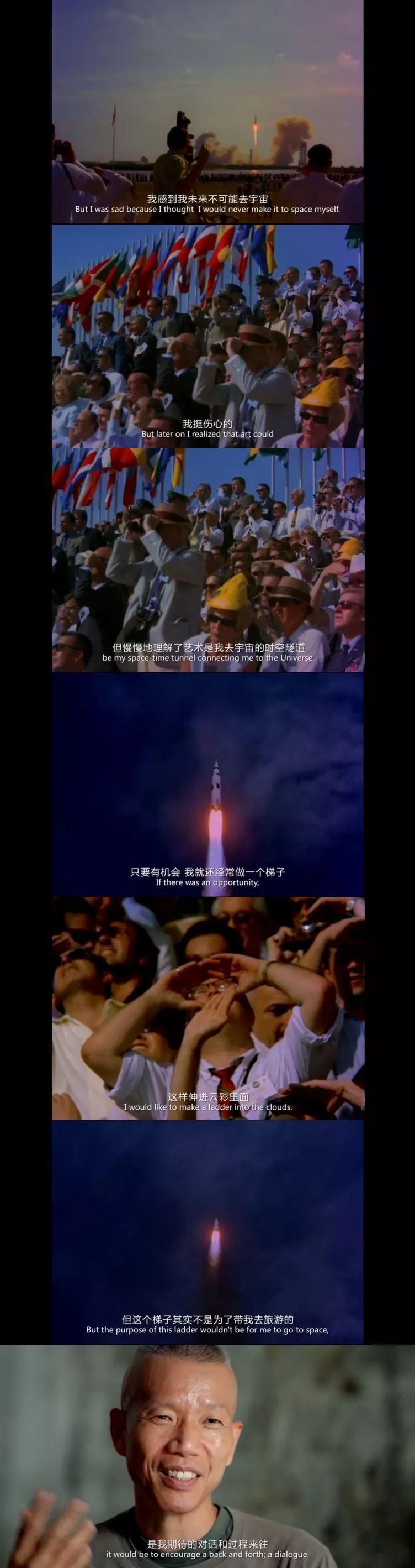 纪录片中也揭露他壮观艺术背后的另一个真实—内心的脆弱、挣扎、妥协,和对家人、故乡、祖国土地深厚内敛的家国情怀。既是一个从中国出发、成为具国际影响力艺术家的励志故事,也体现着新时代中国人的追求和精神。