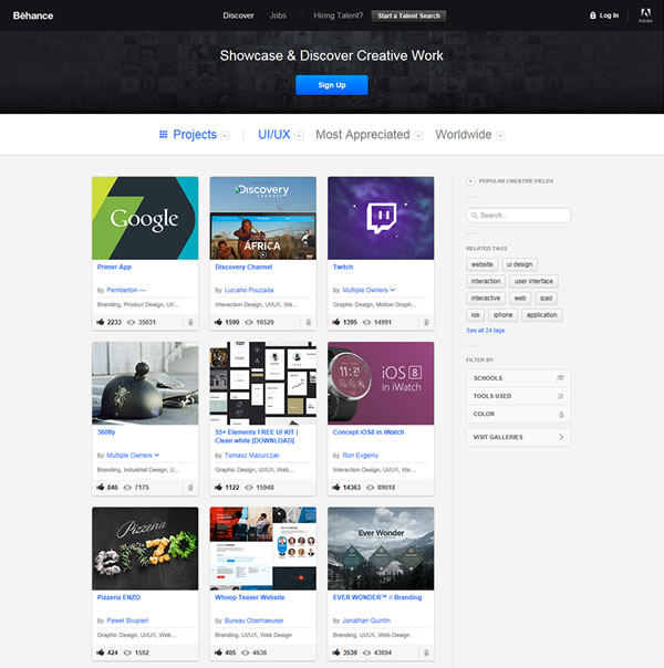 Behance是2006年创立的著名设计社区,在上面,创意设计人士可以展示自己的作品,发现别人分享的创意作品(上面有许多质量上乘的设计作品),相互还可以进行互动(评论、关注、站内短信等)。