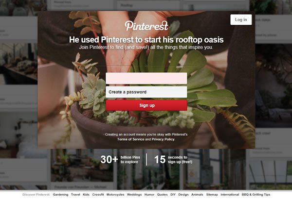 Pinterest采用的是瀑布流的形式展现图片内容,无需用户翻页,新的图片不断自动加载在页面底端,让用户不断的发现新的图片。Pinterest堪称图片版的Twitter!