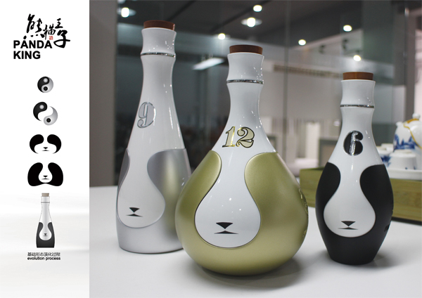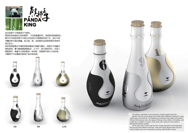 该设计灵感来源于大熊猫的故乡——四川。瓶型的外轮廓设计犹如春笋,不同的酿酝年份瓶型饱满厚实度也不同。瓶口竹节的造型源于中国古代民间以竹盛酒的传统习俗,设计思考中体现了传统与现代的碰撞,加之以黑、银、金颜色的运用易于区分酒本身的档次。设计将熊猫憨态可掬的捂脸形象进行抽象与整合,将眼与手抽象为柔和的面,鼻与嘴抽象硬朗的点,大与小、曲与直的对比。包装上则刚柔兼并,陶瓷为主体的瓶身一体成型,局部细节进行上色处理。