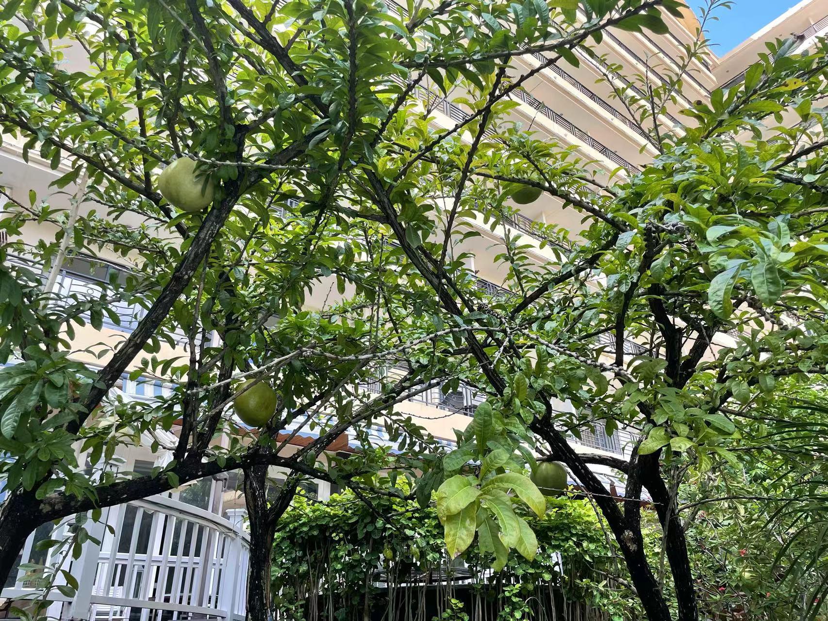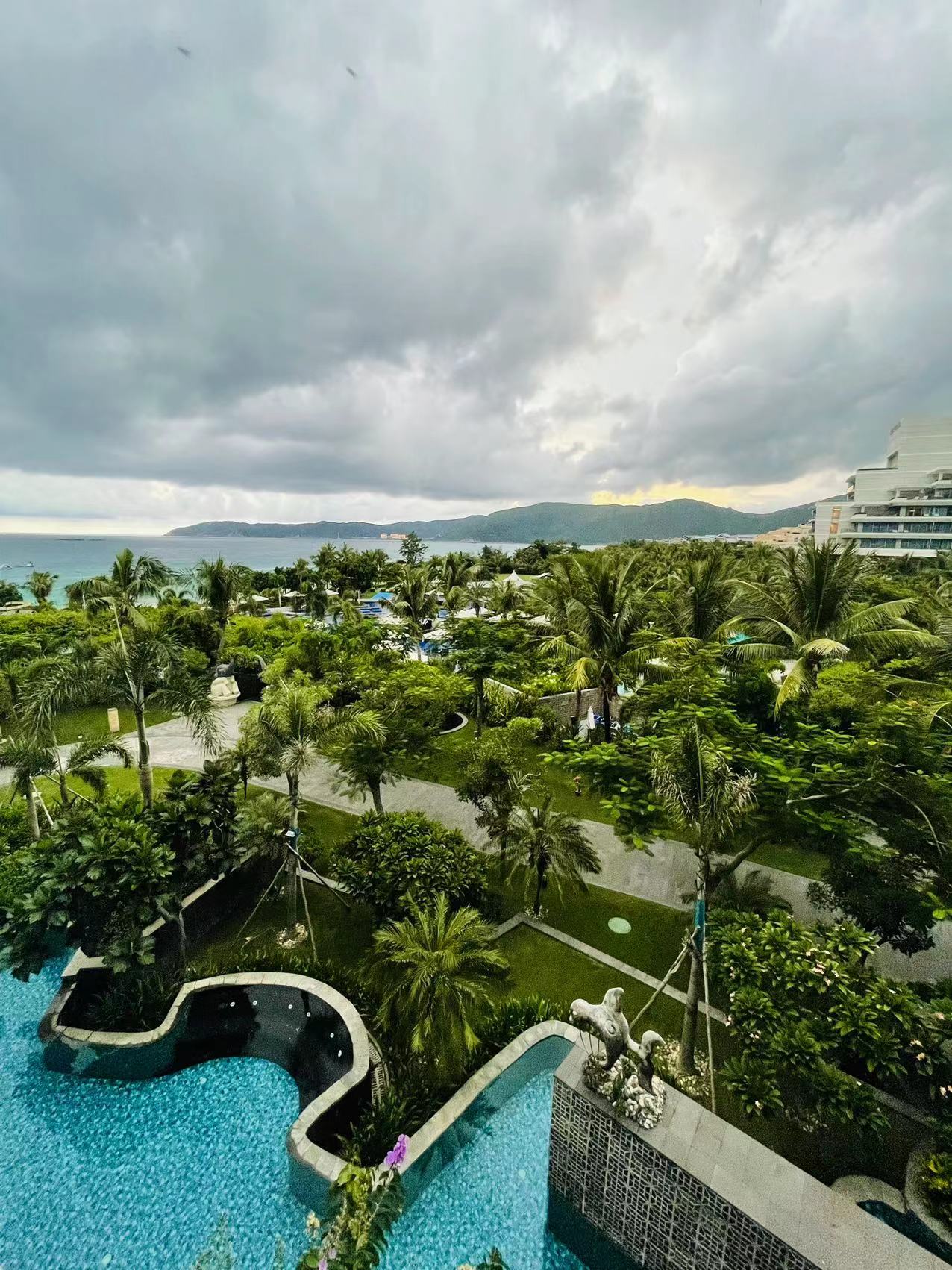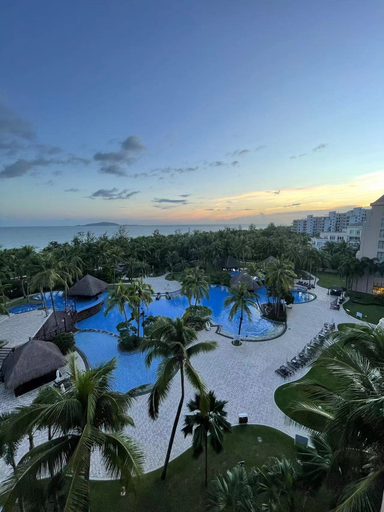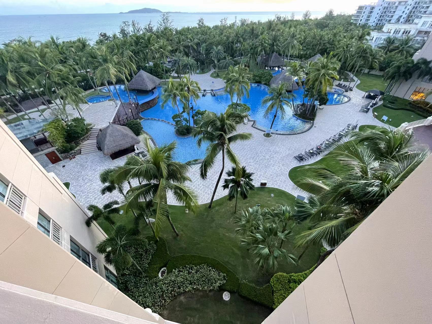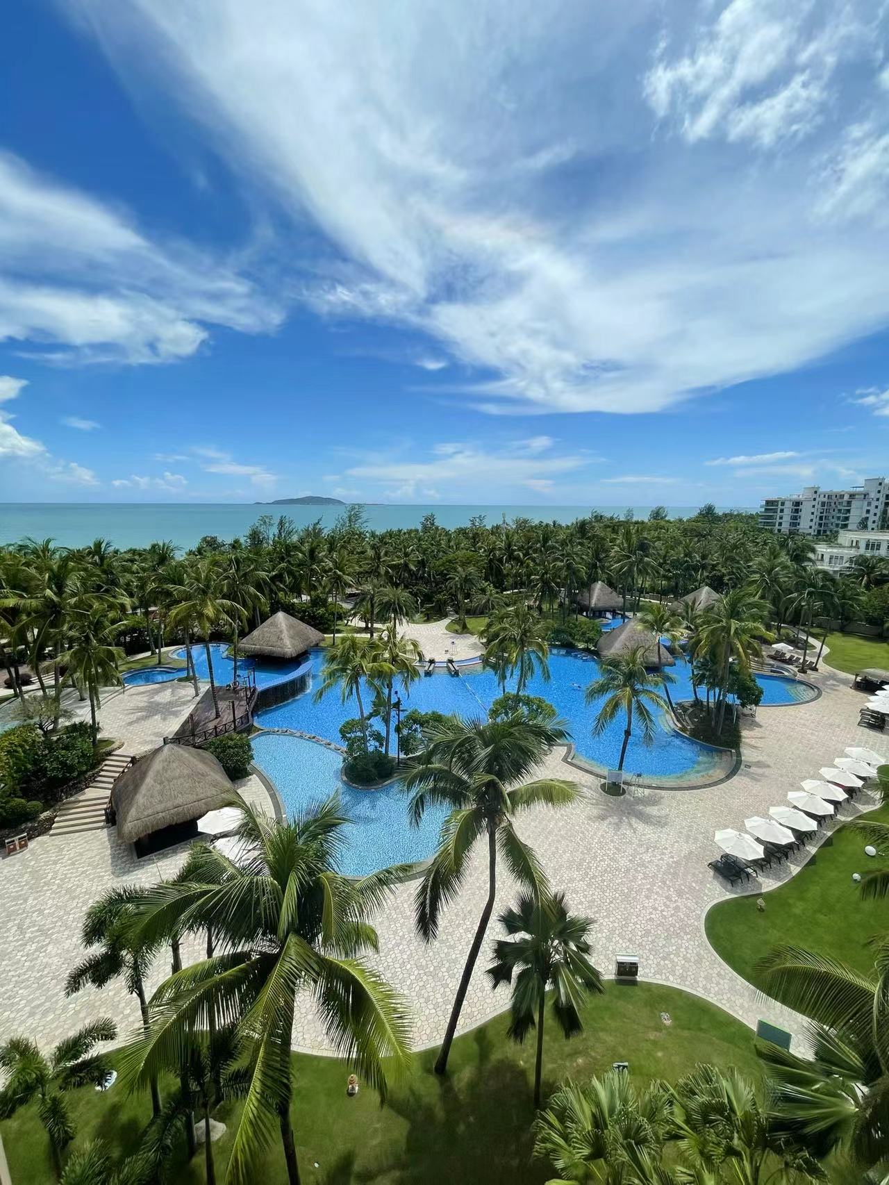 蓝天低得好似手可摘云,由近及远愈来愈密的椰子树,寸步之遥的泳池呈现湖蓝色,远处的海面分明就是大自然亲手制作的果冻......