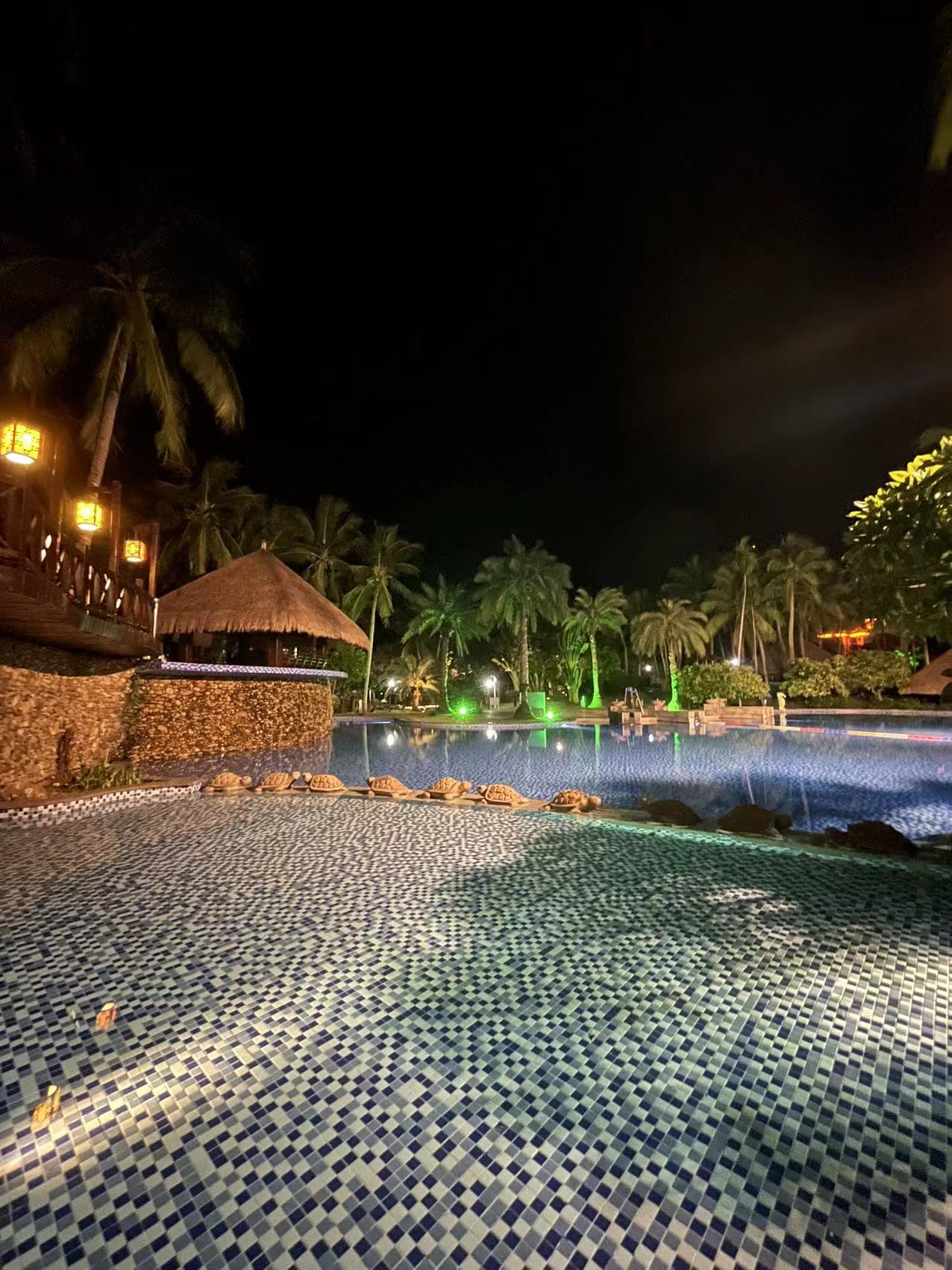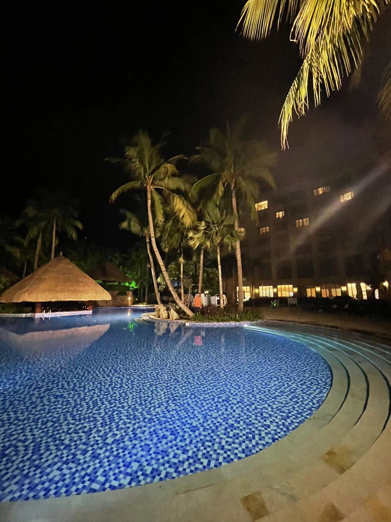 夜幕,悄无声息地来临,似乎它也不想笼罩住眼前这一片天蓝水碧。入夜后,整个酒店最亮眼的,就是静谧的泳池了。